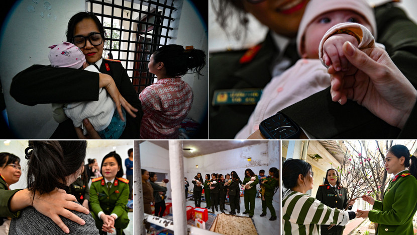Hình ảnh xúc động qua khung cửa buồng giam: Nữ cán bộ Công an Thủ đô bế trên tay cháu bé sơ sinh. Trong buồng này còn có một cháu bé mới sinh được 4 ngày tuổi...