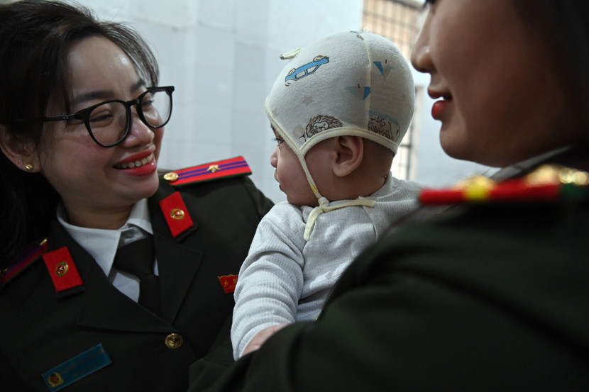 Một nữ cán bộ Công an vui đùa cùng cháu bé trên tay mẹ là phạm nhân tại Trại tạm giam số 2 - CATP Hà Nội. Khoảnh khắc này thật đẹp và ấm áp tình người
