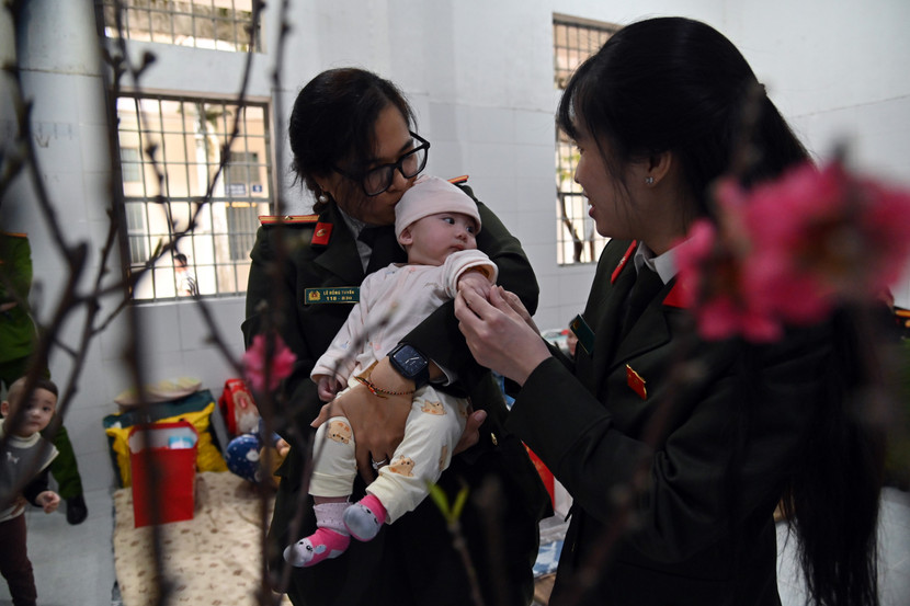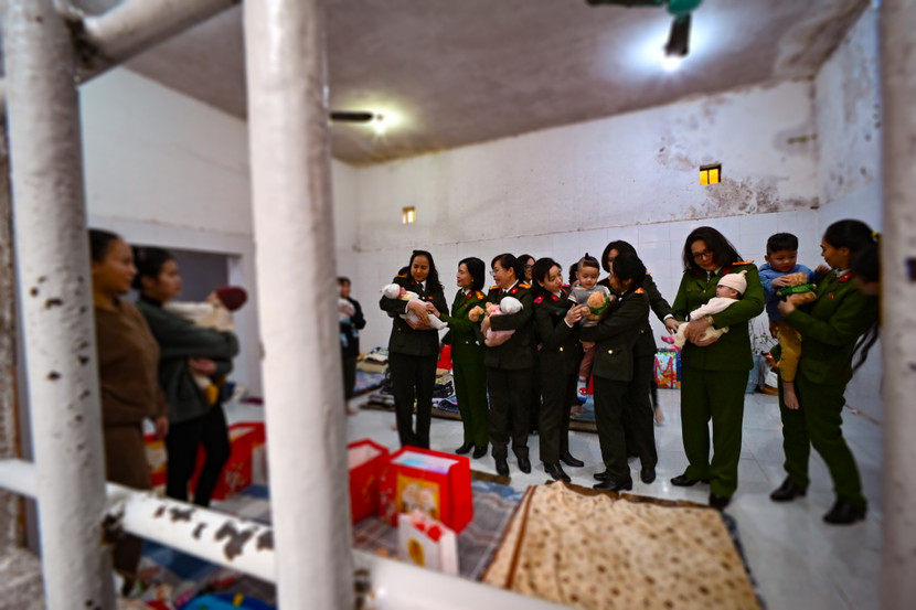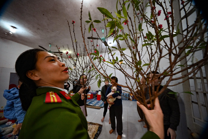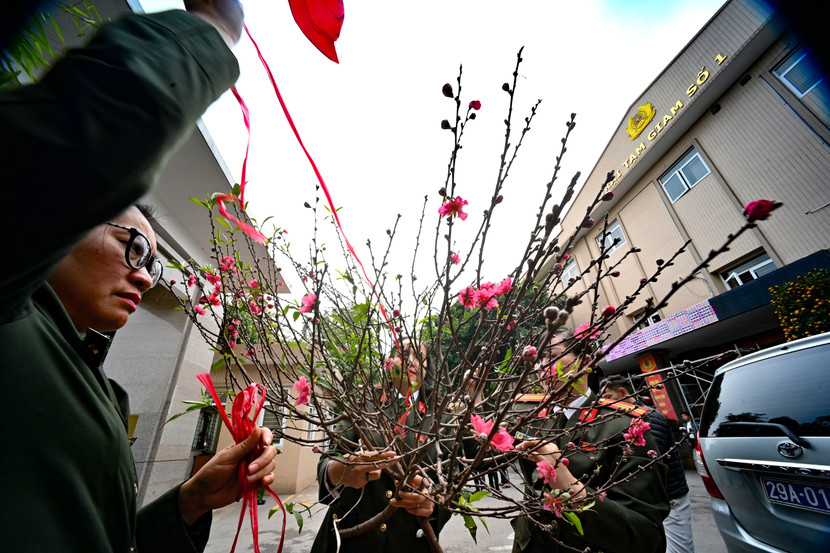 Khoảnh khắc cành đào xuân được đưa vào khu vực các nữ phạm nhân đang chăm sóc con. Sắc hoa rực rỡ dường như làm bừng sáng không gian vốn ảm đạm, mang theo hy vọng về một năm mới an lành và hướng thiện.