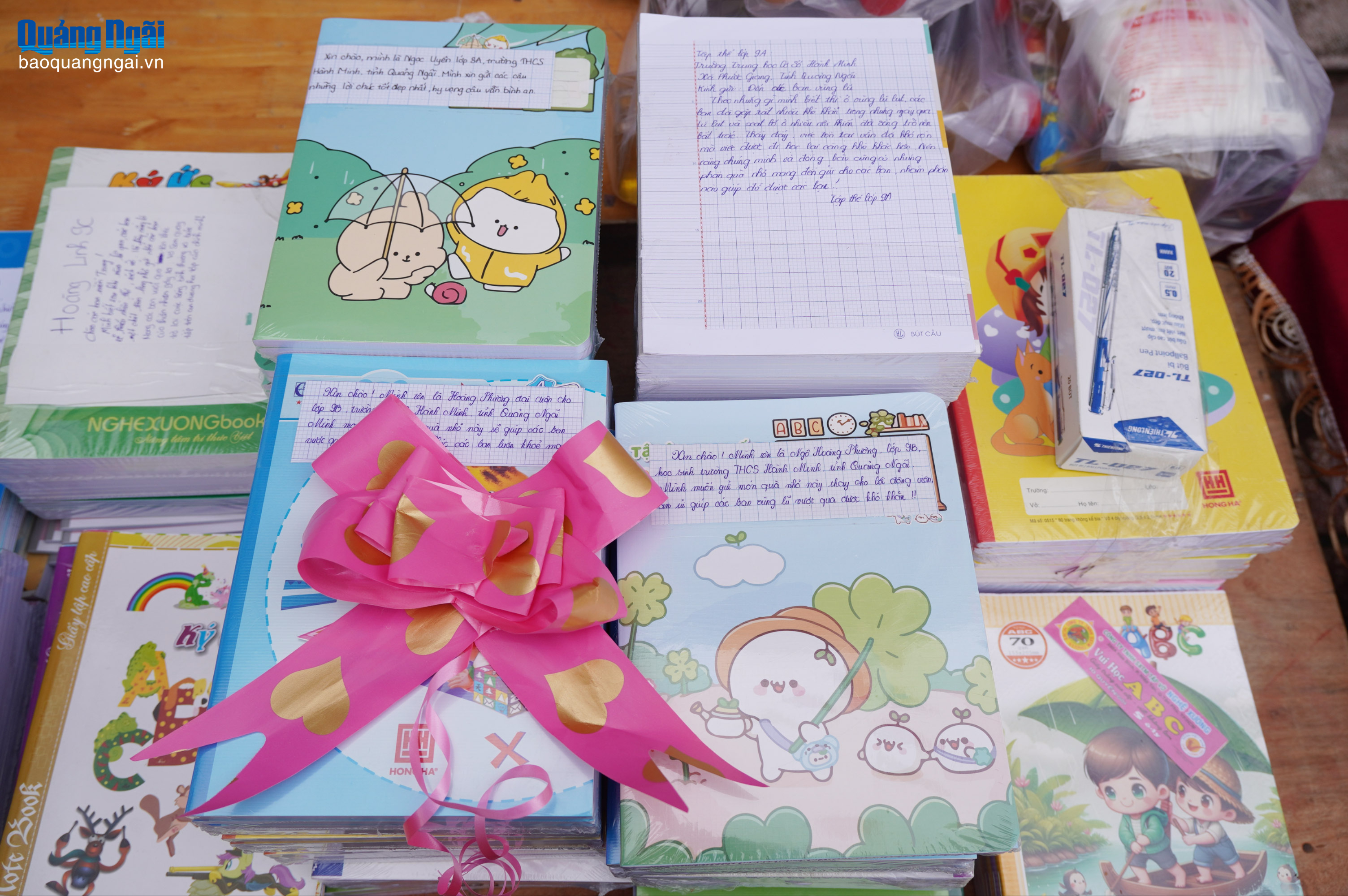 Những lời chúc được dán cẩn thận vào mỗi phần vở gửi đến học sinh vùng lũ.
