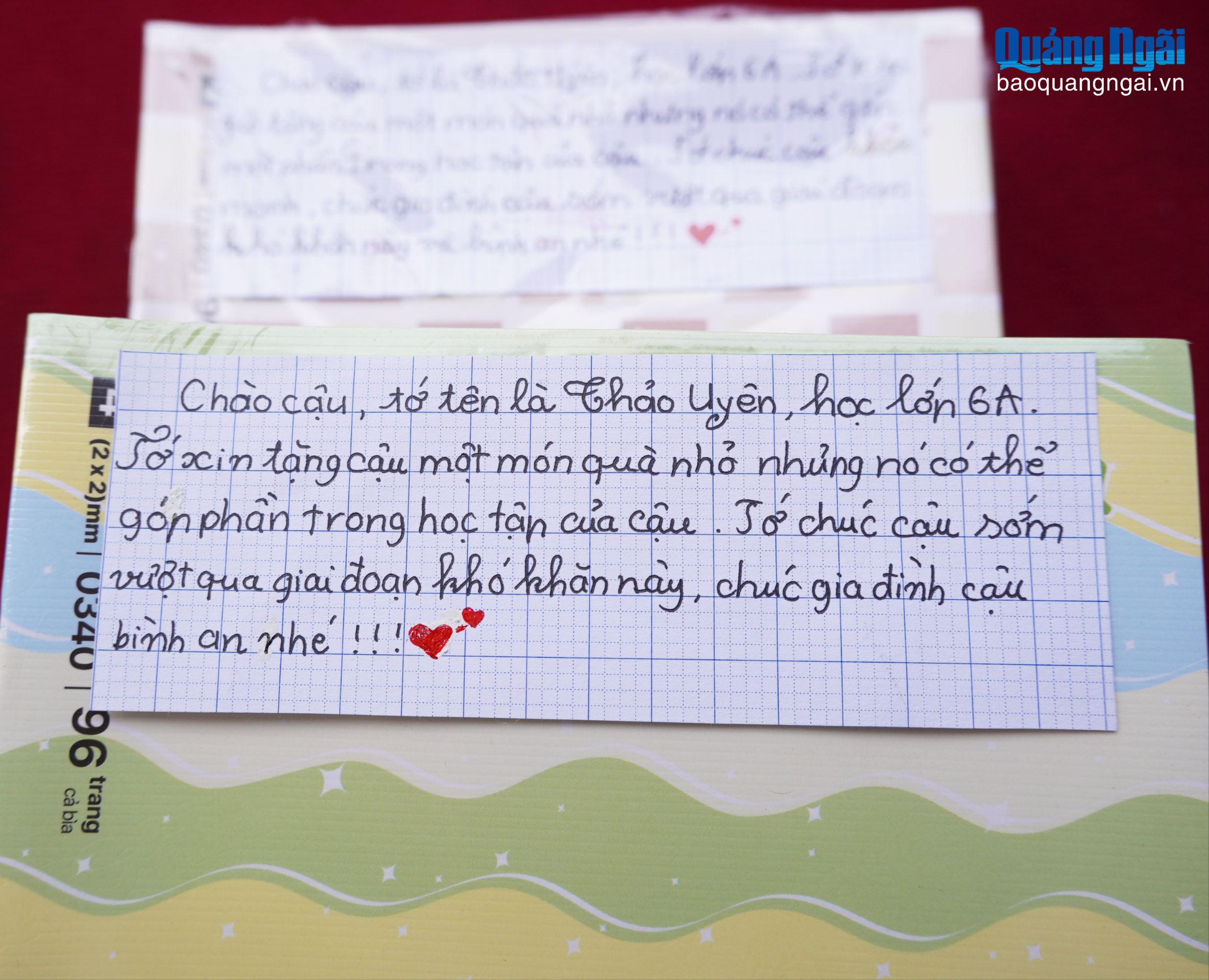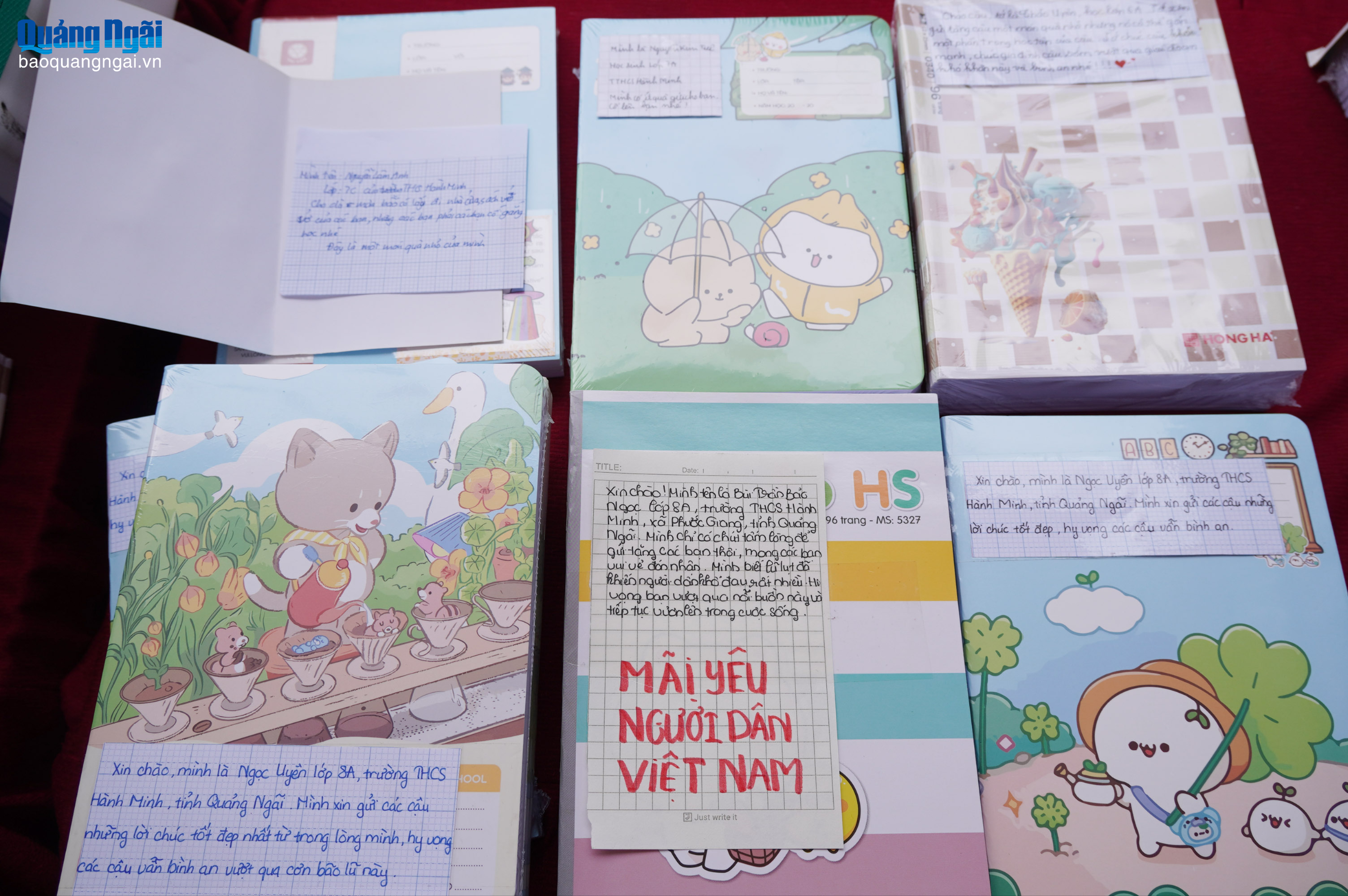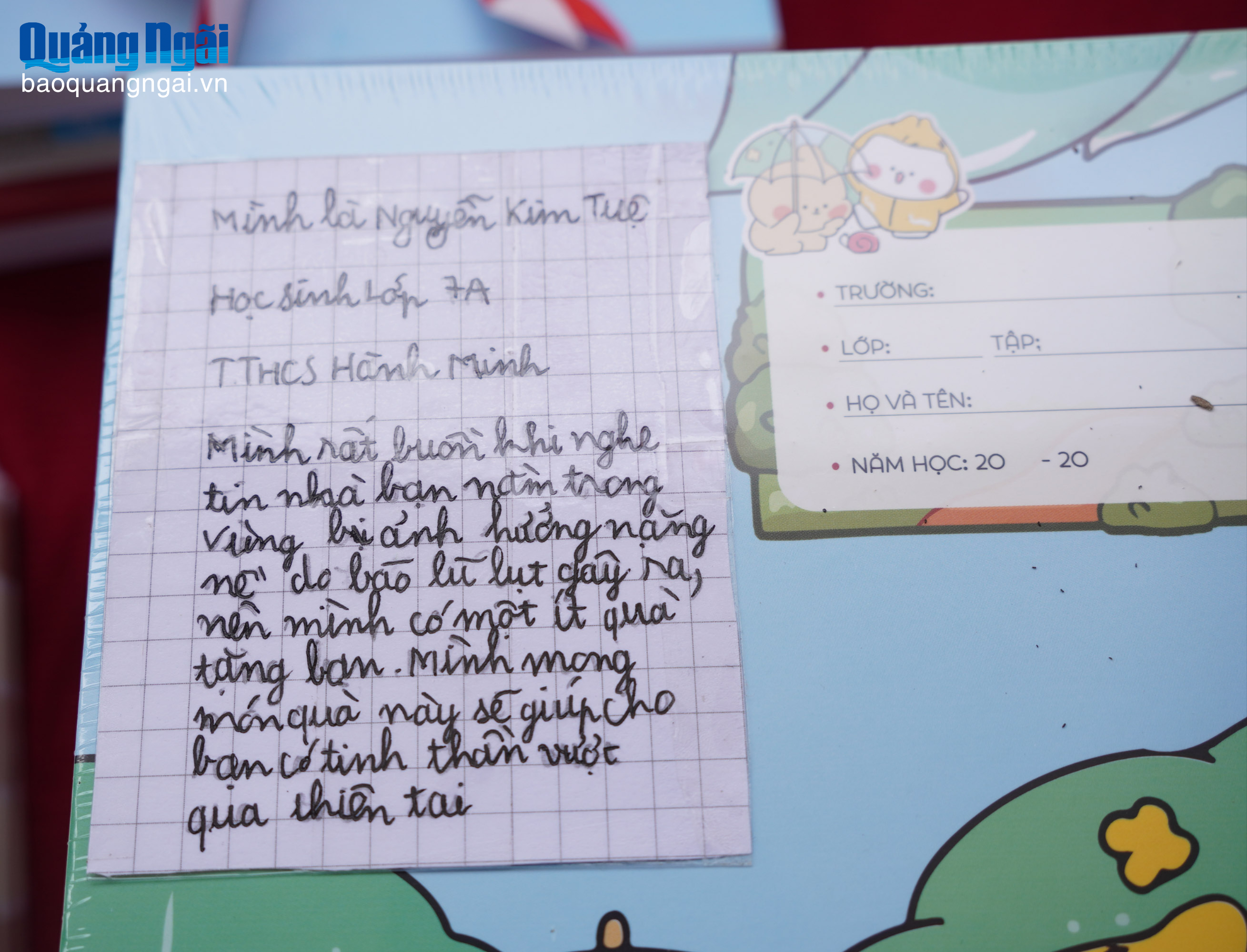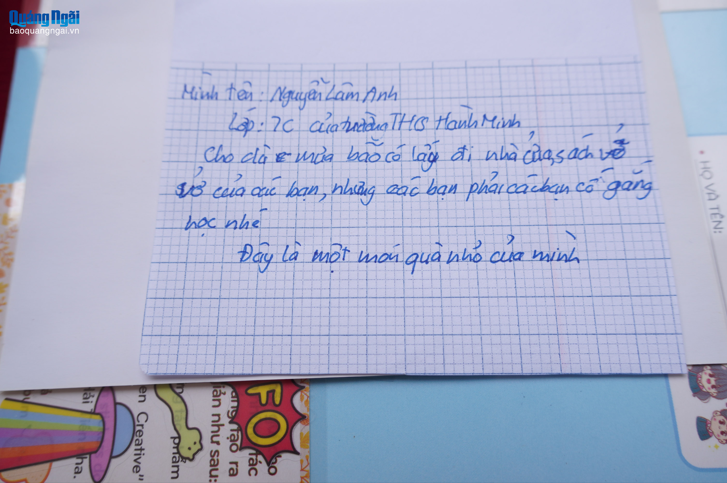 Nhiều em học sinh ở Quảng Ngãi đã gửi tình cảm san sẻ với những thiệt hại, khó khăn mà các bạn cùng trang lứa tại các vùng lũ phải gánh chịu. Cùng với việc gửi các phần quà, các em học sinh Trường THCS Hành Minh, xã Phước Giang còn gửi kèm những lời chúc động viên các bạn vượt qua khó khăn, sớm trở lại trường học và cùng nhau học thật tốt.