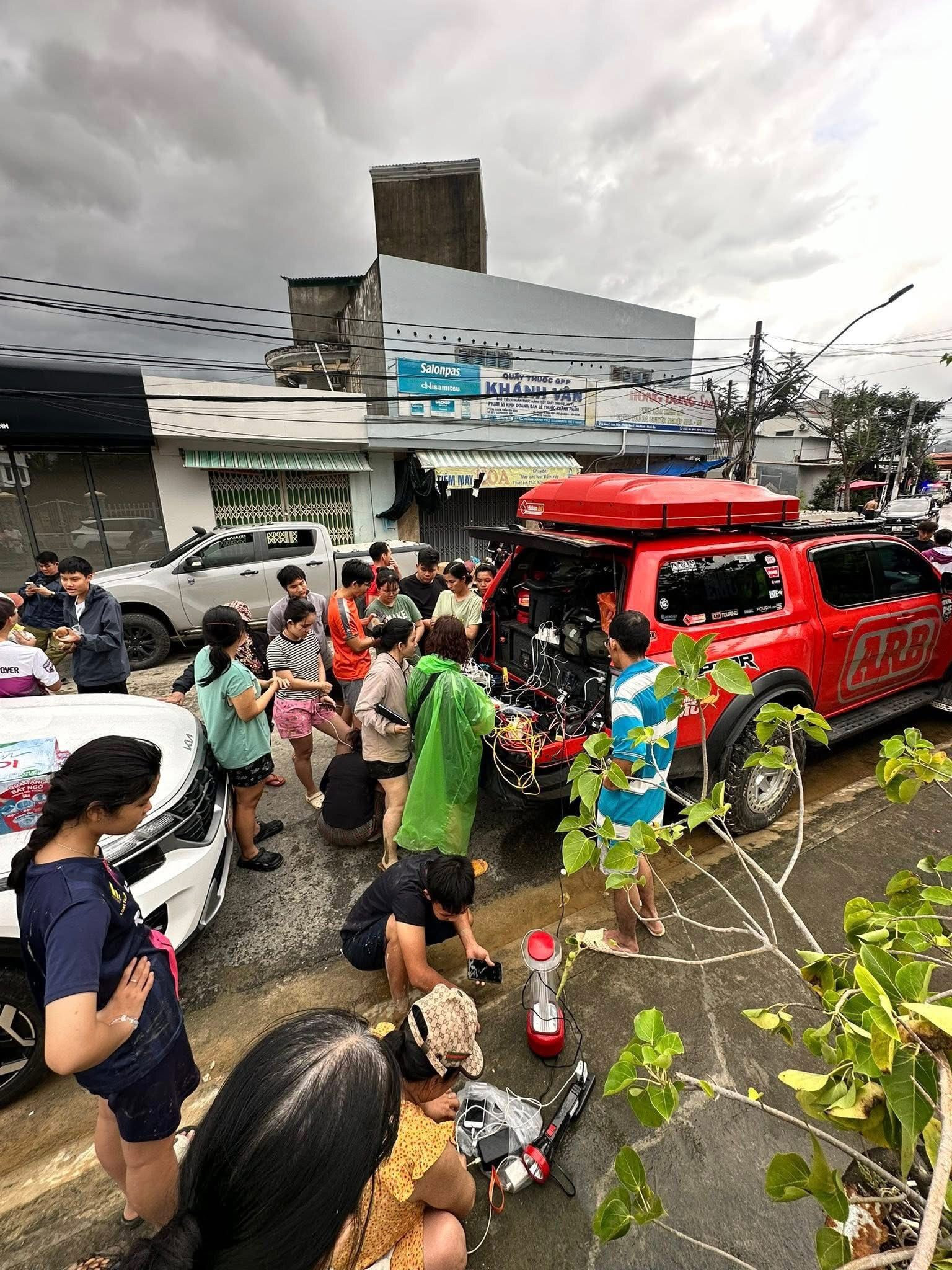 Không chỉ góp nhu yếu phẩm, nhiều nhóm thiện nguyện còn mang theo những thứ bà con cần nhất trong thời điểm khó khăn, đó là điện. Tại Nha Trang, anh Mẫn Phan cùng đội cứu trợ từ TP.HCM chạy xe xuyên đêm, mang theo nguồn điện để người dân sạc điện thoại, gọi về cho gia đình. Khi lương thực đã phần nào ổn định, điện và sóng liên lạc trở thành nhu cầu thiết yếu để trao đổi thông tin và kêu cứu khi cần. Nhóm đã đi từng hộ, mang theo bộ nguồn, giúp bà con kết nối giữa lúc bị chia cắt.