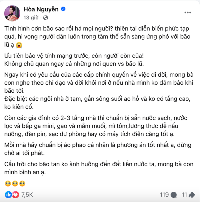 Trong bài đăng, Hòa Minzy viết: "Tình hình cơn bão sao rồi hả mọi người? Thiên tai diễn biến phức tạp quá, hi vọng người dân luôn trong tâm thế sẵn sàng ứng phó với bão lũ. Ưu tiên bảo vệ tính mạng trước, còn người còn của!". Cô nhấn mạnh tầm quan trọng của việc di dời khi được chính quyền yêu cầu, đồng thời gửi lời nhắc nhở cụ thể đến người dân ở vùng nguy hiểm: không nên ở lại những căn nhà tạm, gần sông suối, ao hồ, mà hãy tìm nơi cao ráo, kiên cố để đảm bảo an toàn.