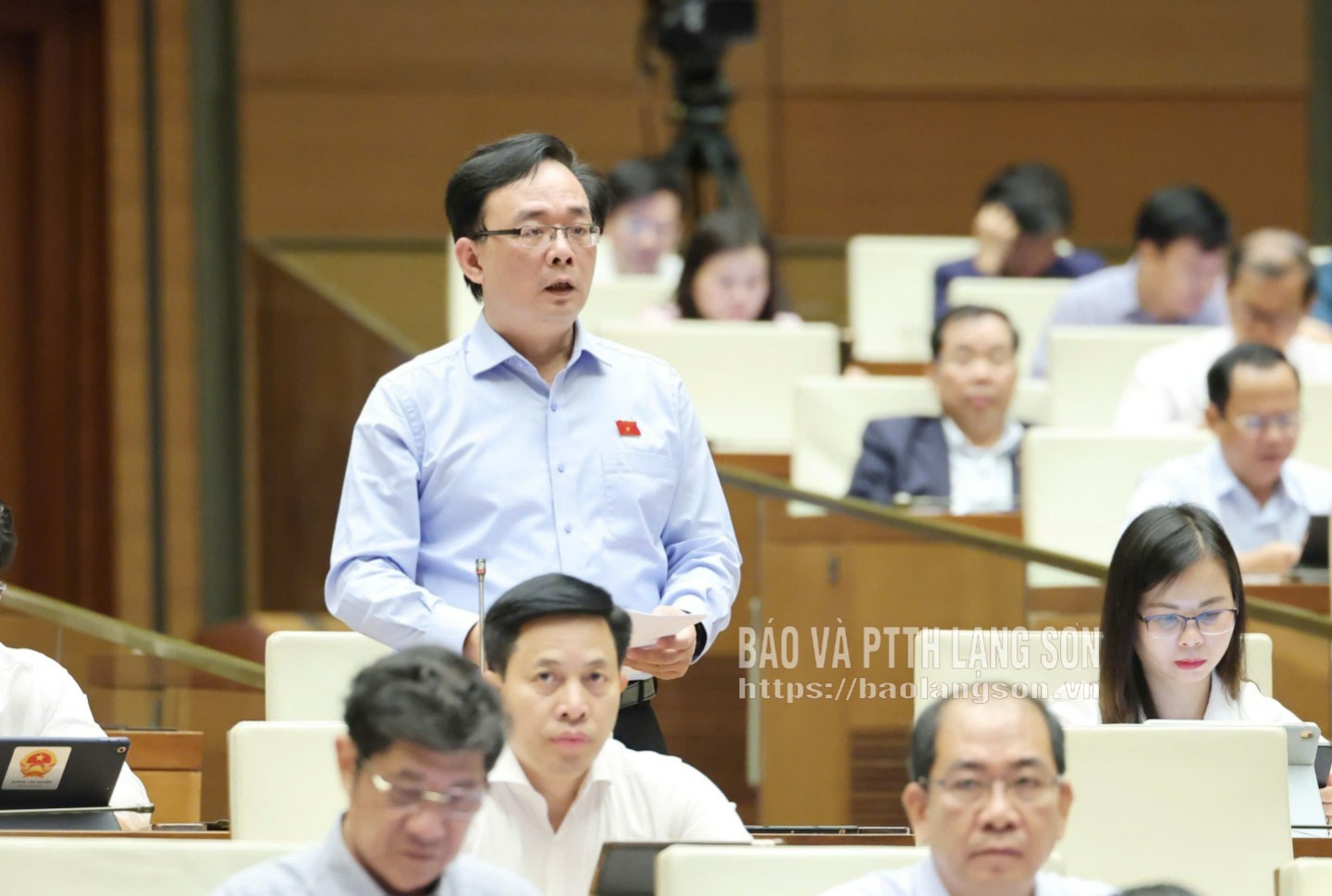 Đồng chí Triệu Quang Huy, Tỉnh ủy viên, Ủy viên Ủy ban Kinh tế và Tài chính của Quốc hội, Phó trưởng đoàn chuyên trách Đoàn đại biểu Quốc hội tỉnh phát biểu tại hội trường góp ý dự án luật tại kỳ họp thứ 9, Quốc hội khóa XV