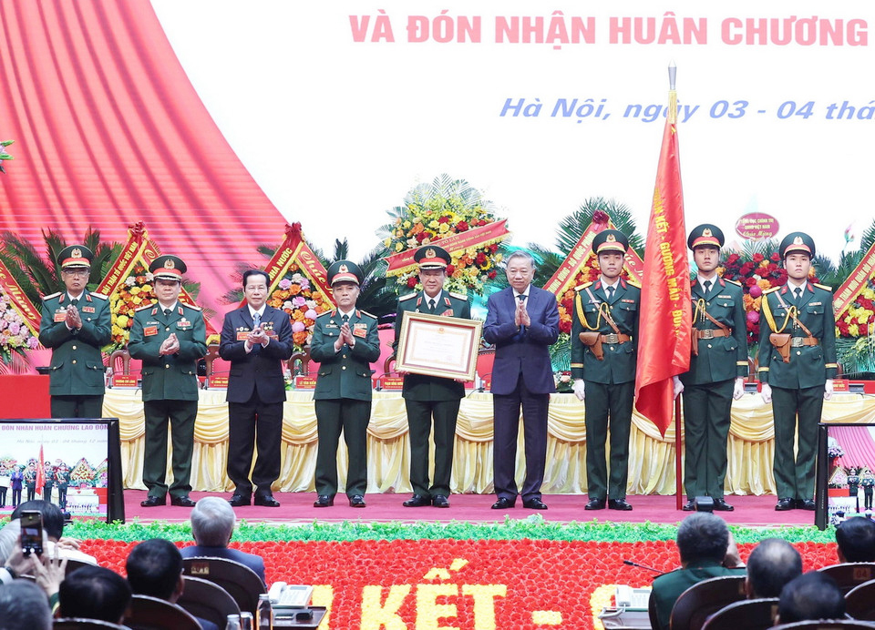 Tổng Bí thư Tô Lâm trao Huân chương Lao động hạng Nhất cho Hội Cựu chiến binh Việt Nam nhân kỷ niệm 35 năm ngày Ngày truyền thống Hội Cựu Chiến binh Việt Nam. Ảnh: TTXVN