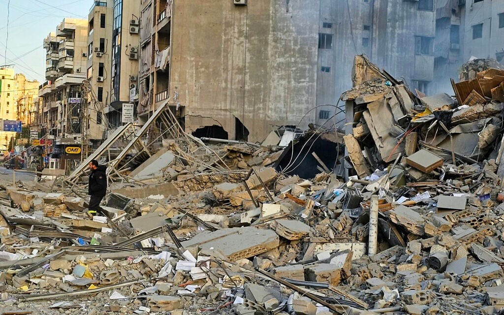 Đống đổ nát tại khu vực ngoại ô phía nam Beirut sau các đợt không kích của Israel rạng sáng 6-3. Ảnh: AFP