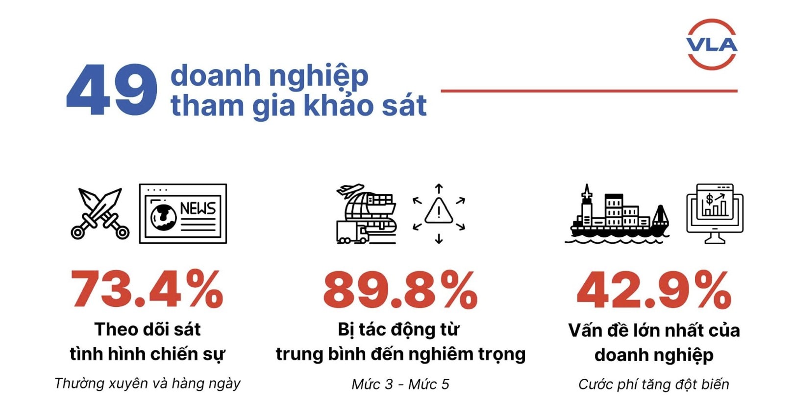 Cuộc khảo sát của Hiệp hội Doanh nghiệp Dịch vụ Logistics Việt Nam (VLA) thực hiện trên 49 thành viên với kết quả vừa được công bố cho thấy, gần 90% số doanh nghiệp bị ảnh hưởng từ xung đột Trung Đông ở những mức độ khác nhau.
