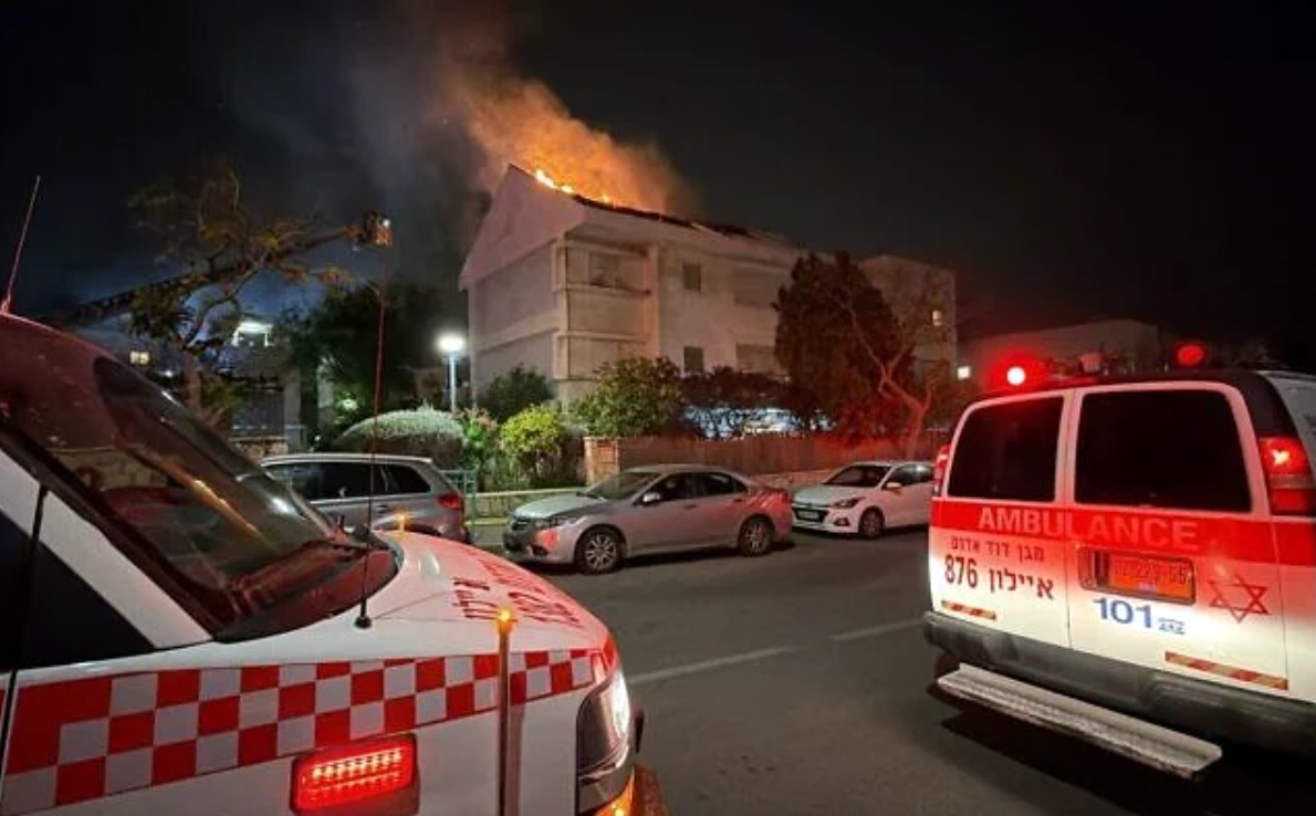 Khói bốc lên sau một vụ tấn công vào tòa nhà tại thị trấn Shoham ở miền Trung Israel hôm 13-3. Ảnh: Timesofisrael