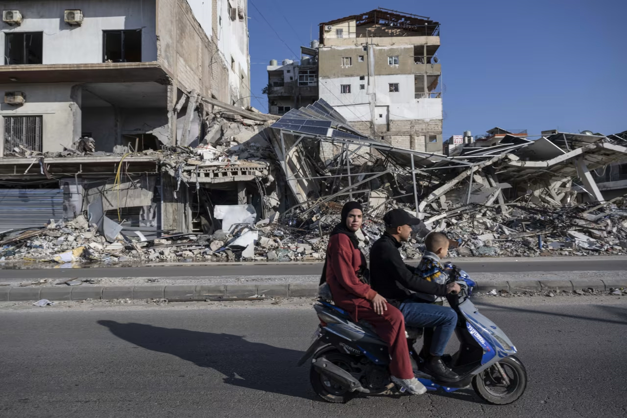 Một gia đình đi xe máy ngang qua những tòa nhà bị phá hủy do các cuộc tấn công của Israel ở Tyre, Lebanon. Ảnh: Anadolu