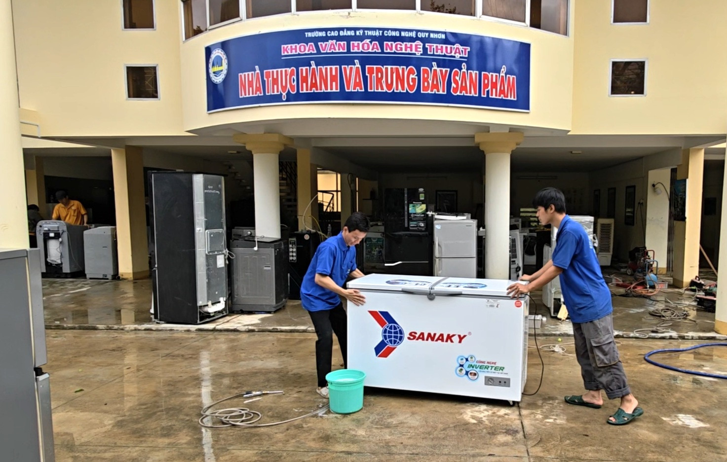 Những ngày sau lũ, khuôn viên Trường Cao đẳng Kỹ thuật Công nghệ Quy Nhơn nhộn nhịp hơn hẳn. Đây là điểm tiếp nhận của chương trình sửa chữa điện lạnh – thiết bị gia dụng miễn phí do đoàn viên thanh niên của trường phối hợp Hội điện lạnh Bình Định triển khai từ ngày 23/11.