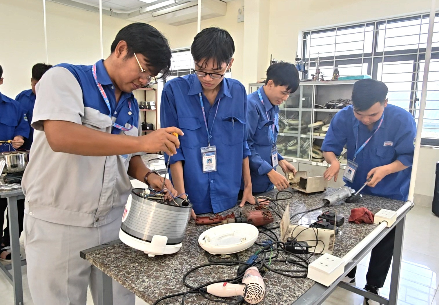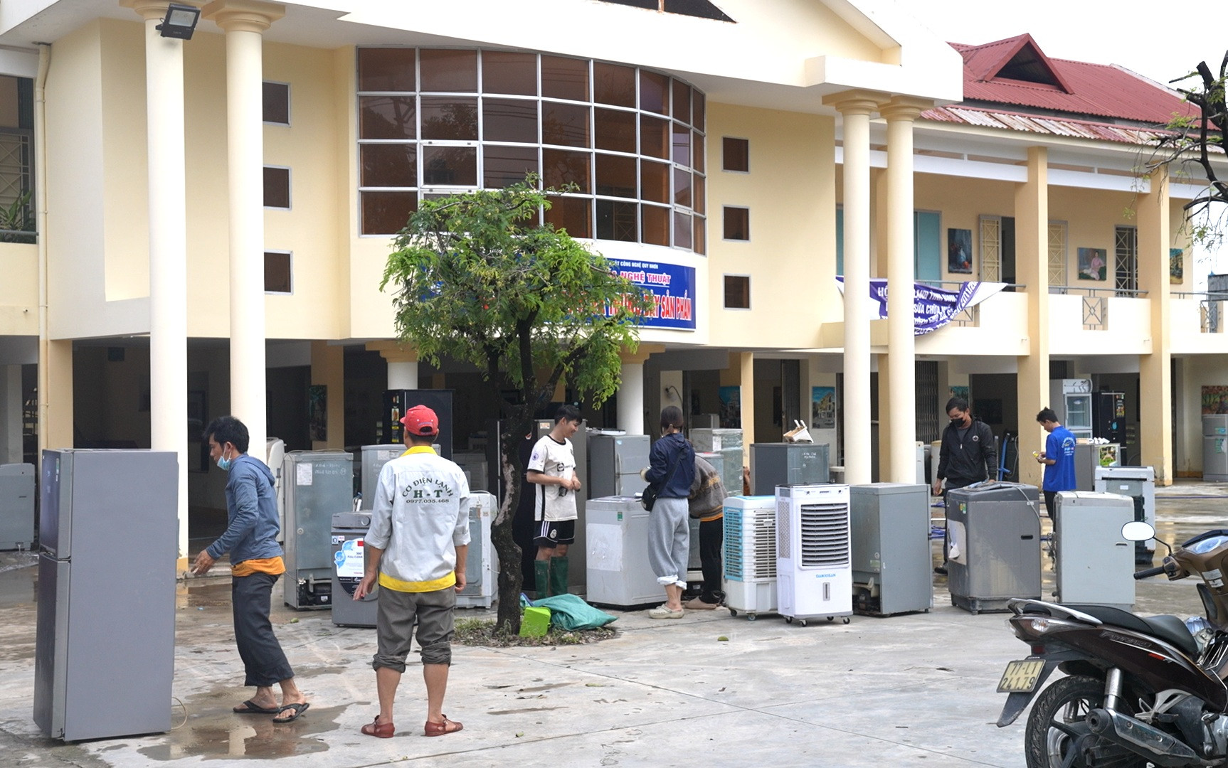 Khuôn viên Trường Cao đẳng Kỹ thuật Công nghệ Quy Nhơn được dùng làm nơi sửa chữa thiết bị điện lạnh giúp người dân. Ảnh: Dũng Anh