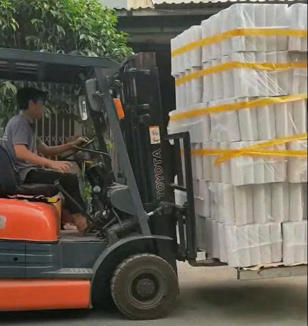Công nhân sử dụng xe nâng chuyên dụng để di chuyển các kiện hàng ra khỏi khu vực cháy. Ảnh: HC