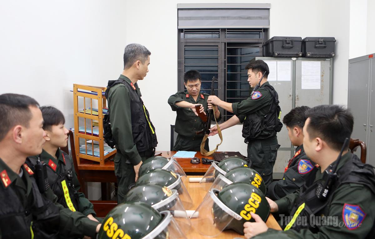 Cán bộ, chiến sỹ cảnh sát cơ động chuẩn bị công cụ hỗ trợ cho các chuyến tuần tra.