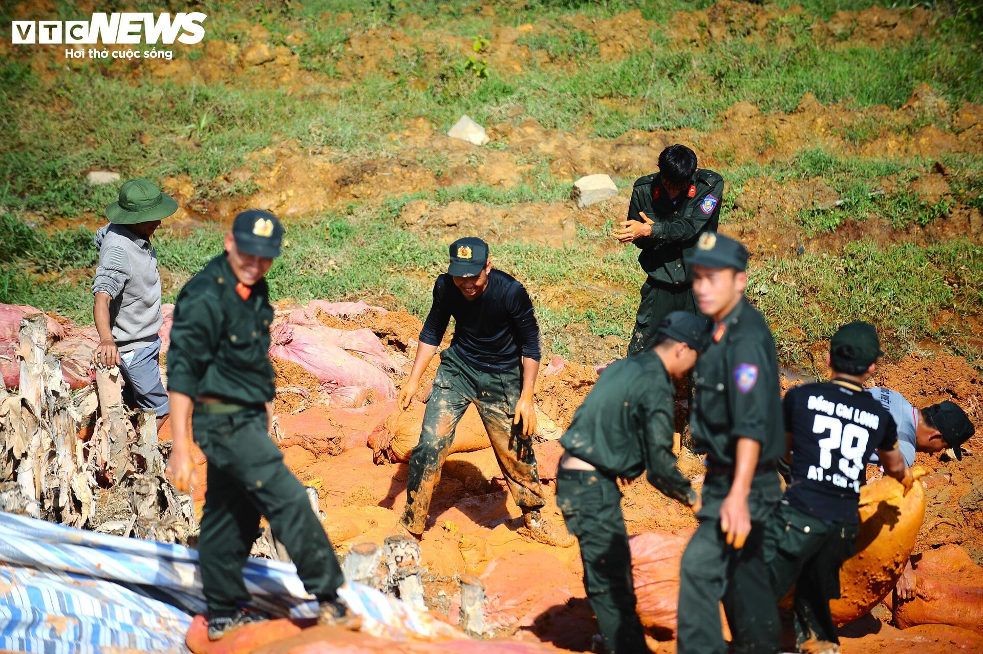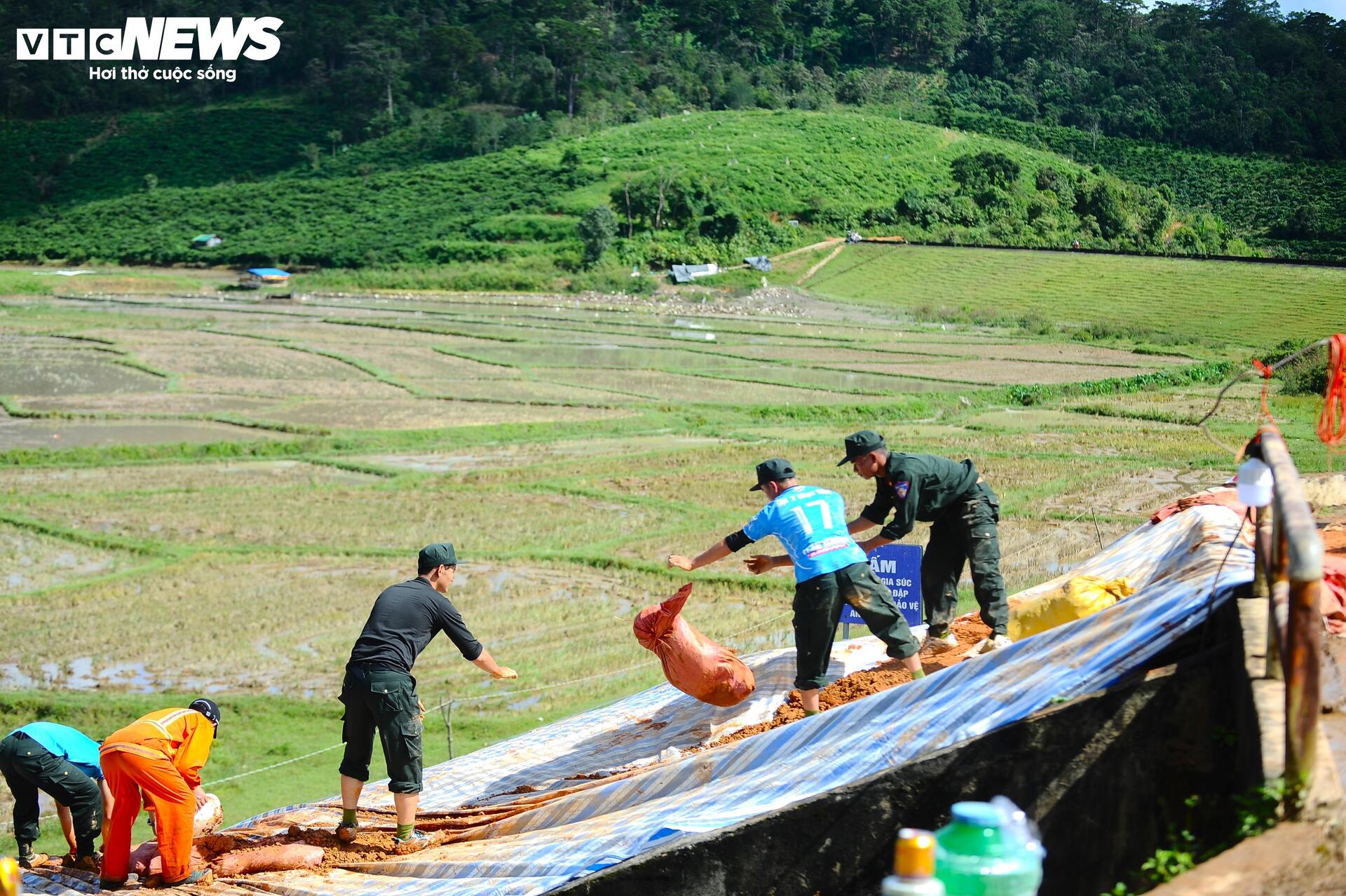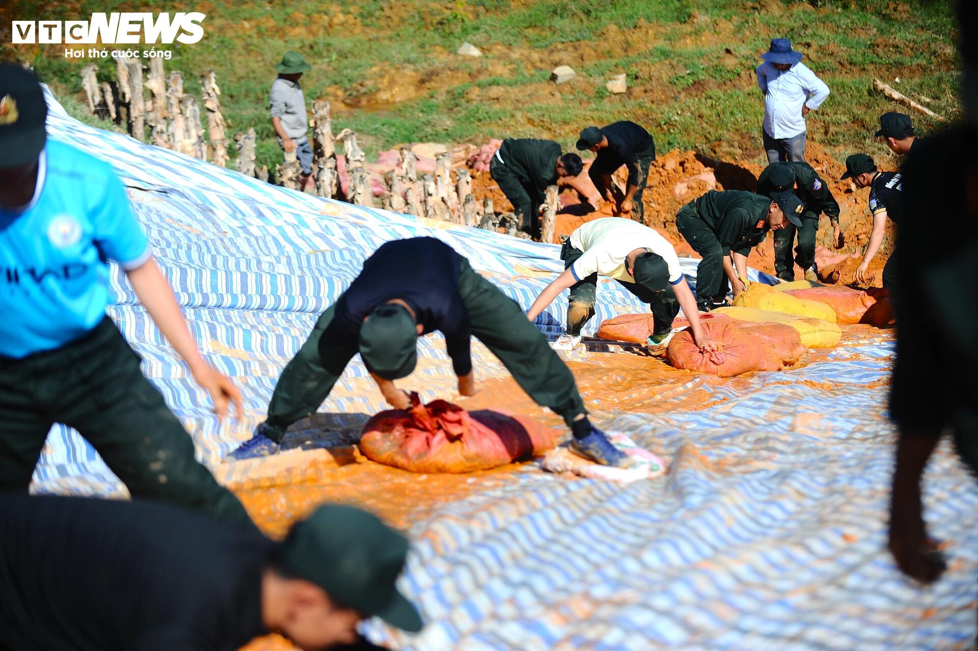 Trong đêm 7/11 và sáng 8/11, hàng chục chiến sĩ bộ đội, công an có mặt tại hiện trường, phối hợp với người dân gia cố các vết nứt xuất hiện trên thân đập.