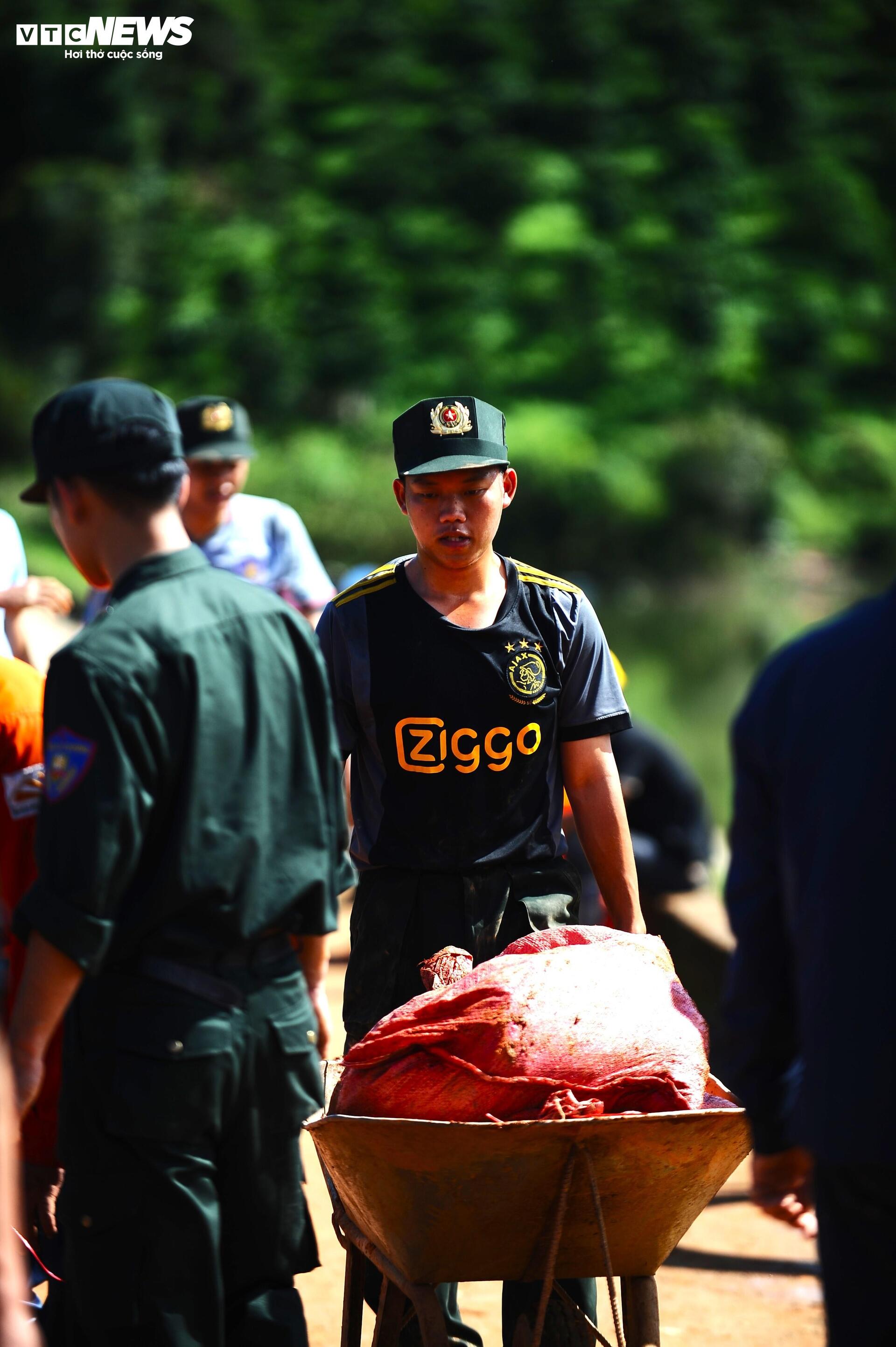 Nhiều người dân có mặt từ tối hôm qua đến sáng nay, cùng bộ đội và công an vận chuyển đất xuống chân đập.