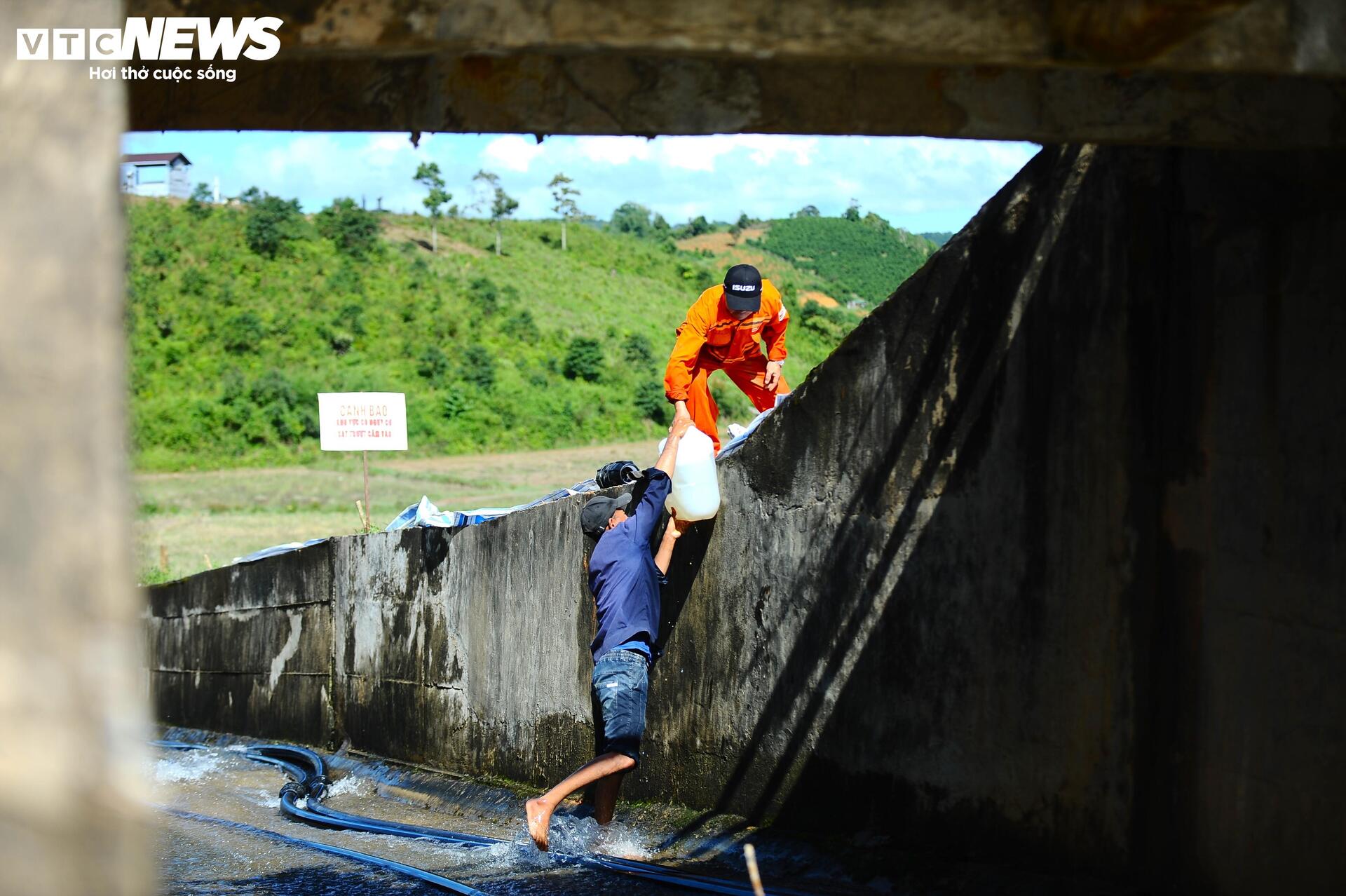 Để giảm áp lực nước, lực lượng chức năng xã Tà Năng đã bố trí nhiều ống xả, dẫn nước từ hồ chảy xuống hạ lưu.