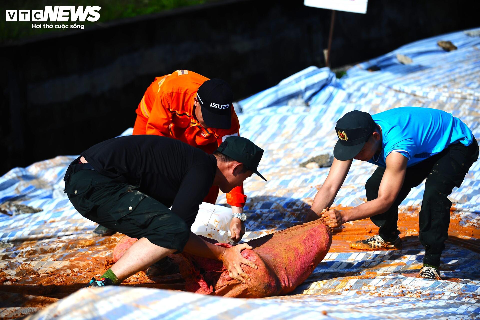 Những bao tải đất lần lượt được di chuyển xuống bên dưới chân đập.