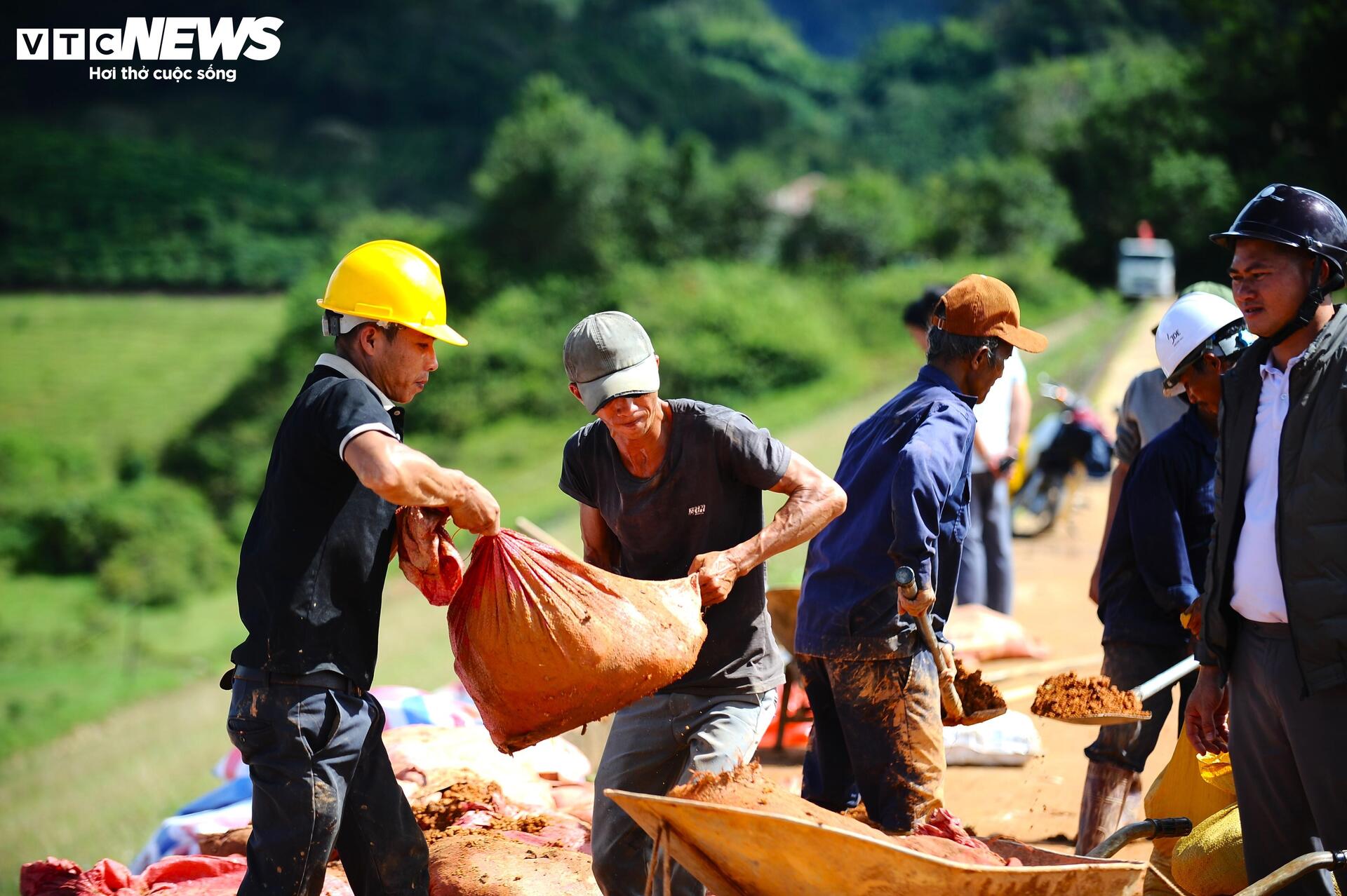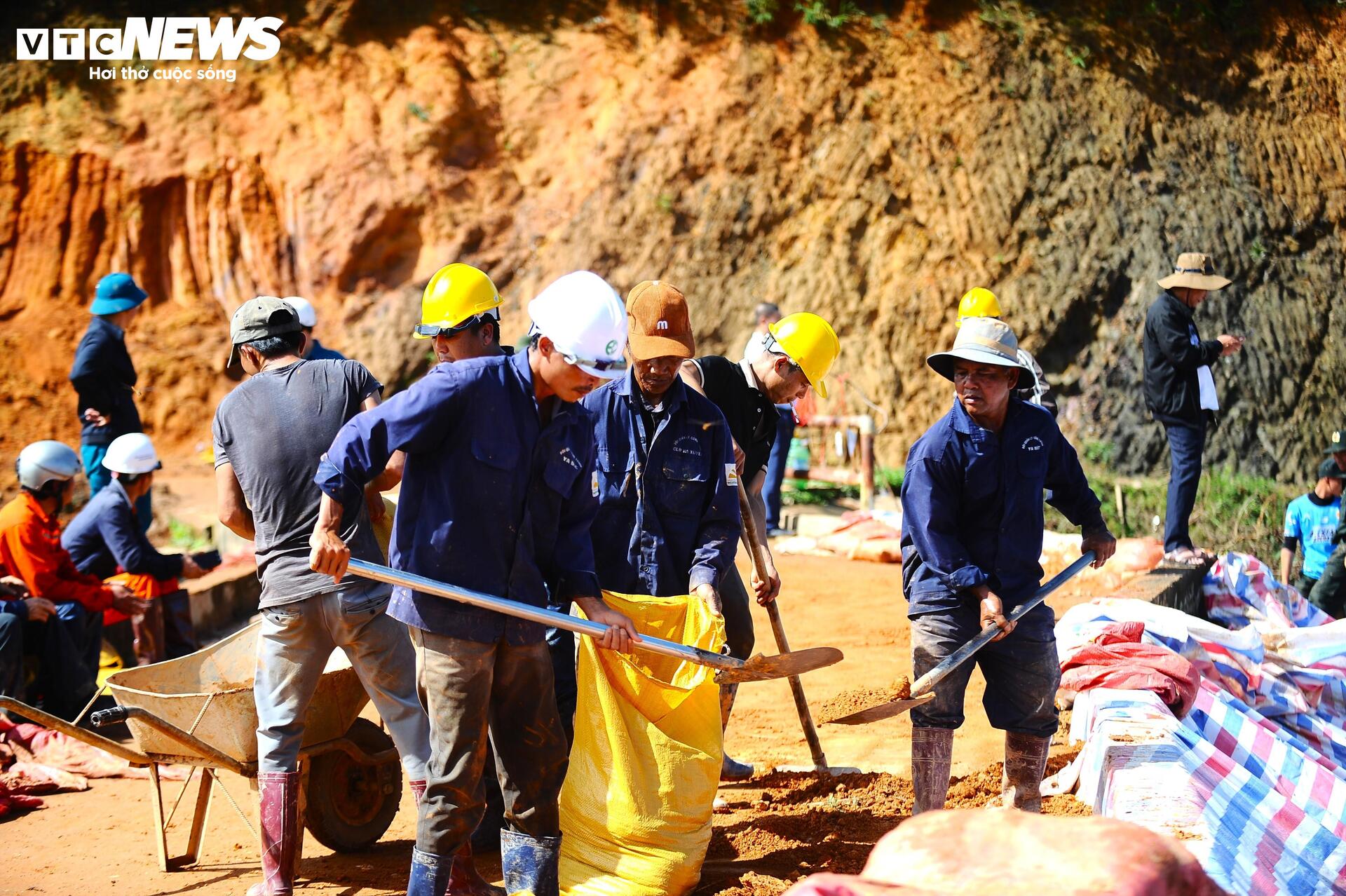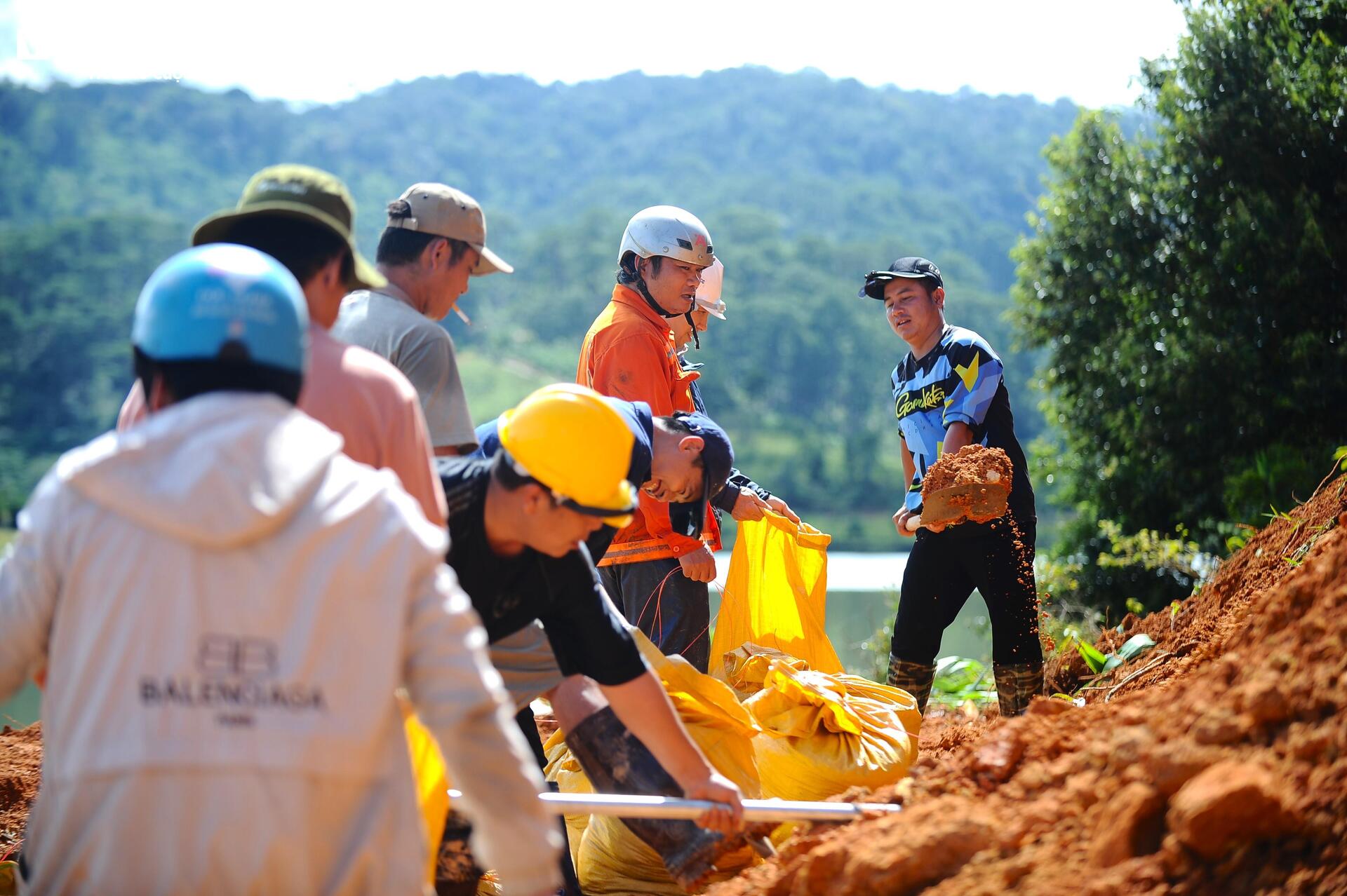 Các chiến sĩ lực lượng Cơ động, Công an tỉnh Lâm Đồng hối hả đắp đất.