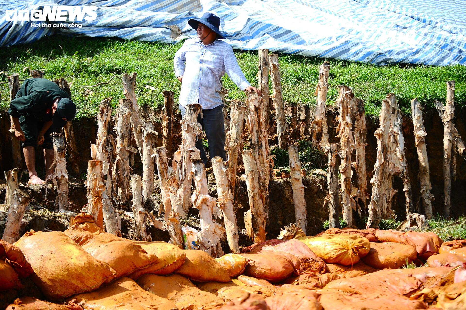 Người dân địa phương cũng tập trung, tích cực phối hợp với lực lượng chức năng gia cố chân đập.