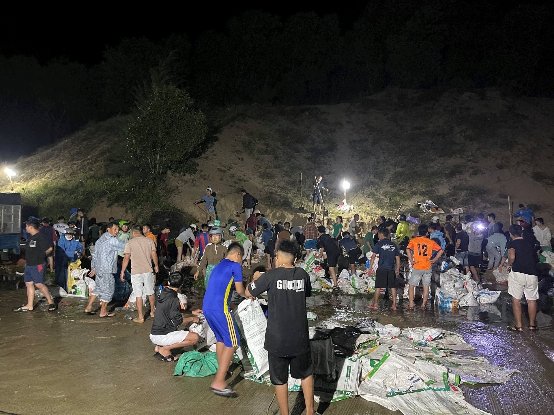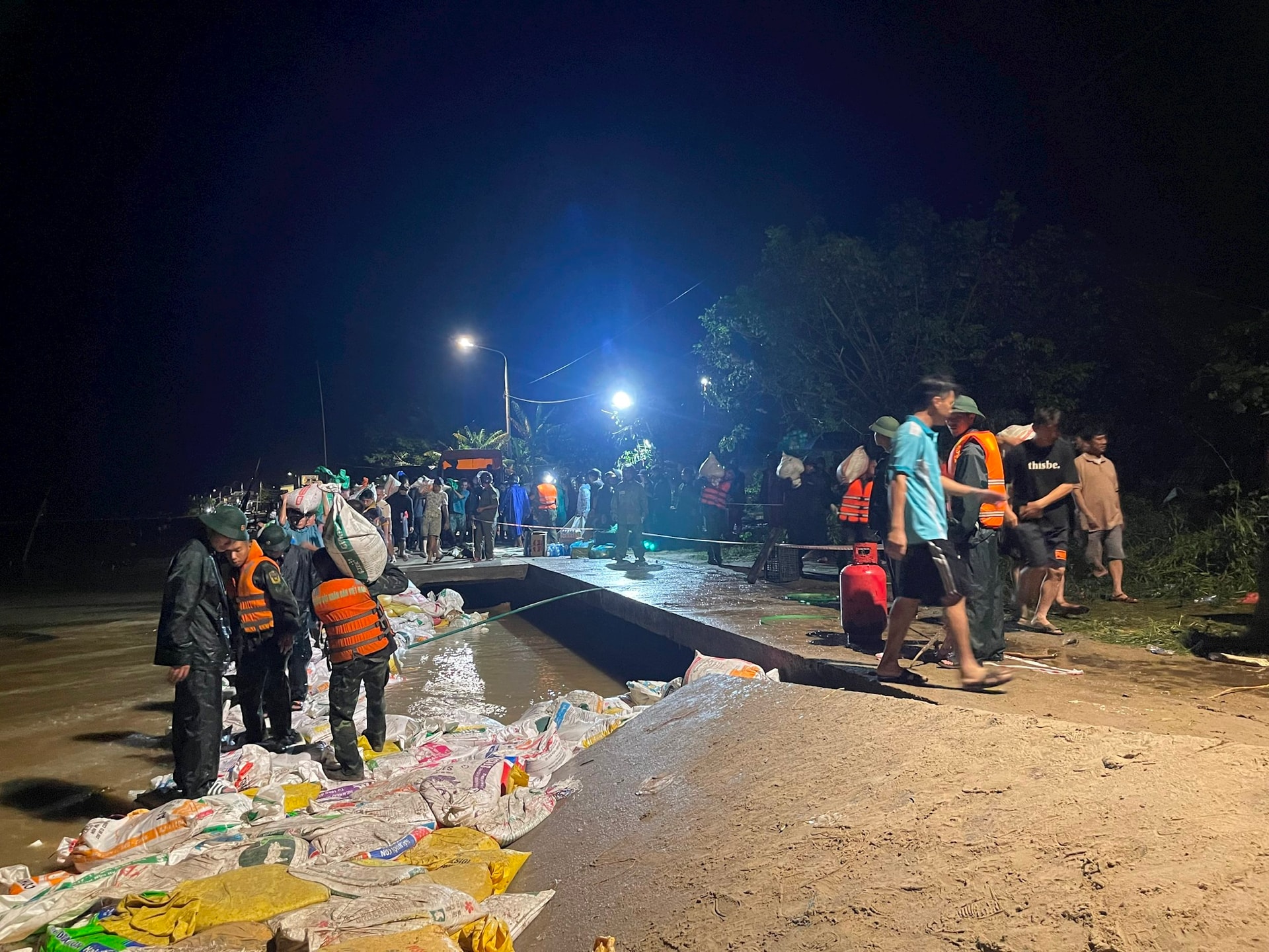 Trong tình huống khẩn cấp, gần 1.000 người được huy động làm việc xuyên đêm để gia cố, đắp bao cát bảo vệ công trình và an toàn cho người dân.
