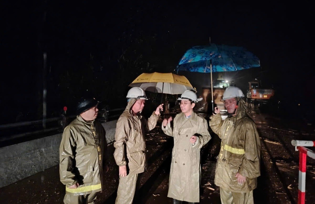 Ông Nguyễn Thanh Bình - Giám đốc Khu Quản lý đường bộ III, Cục Đường bộ Việt Nam (thứ 2 từ phải sang) có mặt tại hiện trường chỉ đạo các đơn vị xuyên đêm khắc phục sự cố sạt lở đèo Lò Xo.