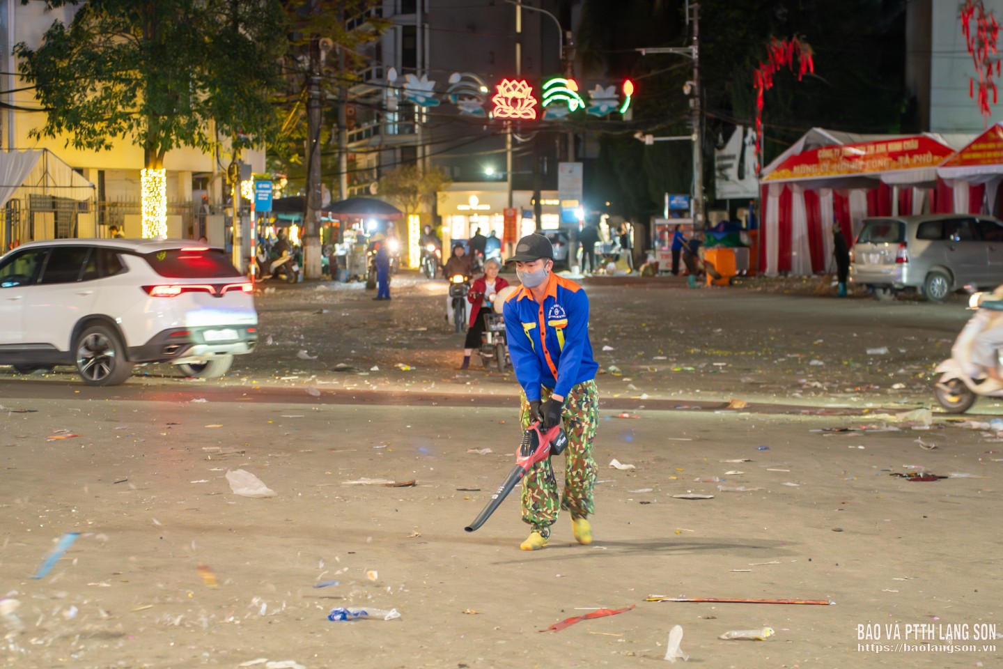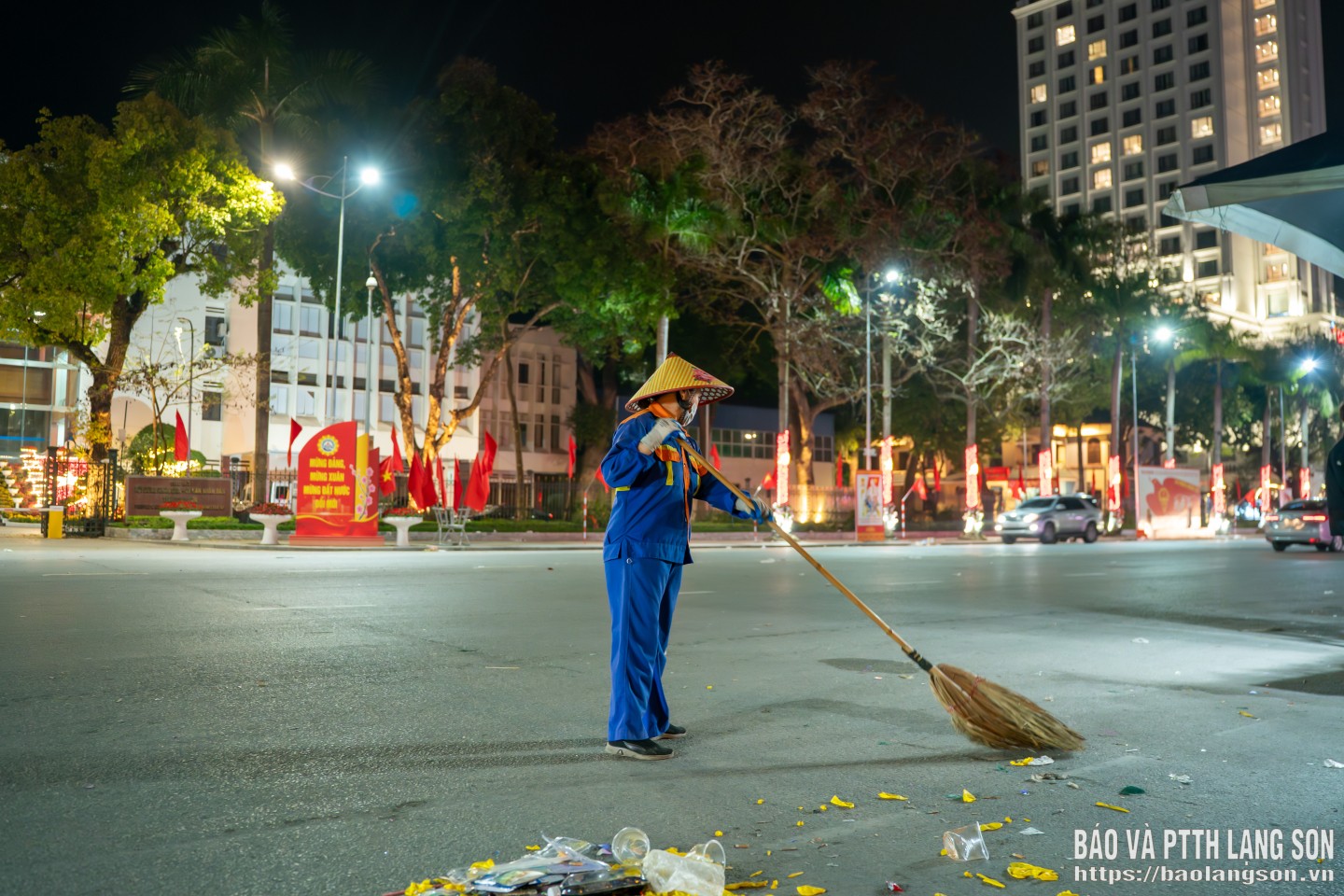 Khi nhiều người đã nghỉ ngơi sau lễ hội, vẫn có những công nhân vệ sinh môi trường thầm lặng làm sạch đường phố (ảnh chụp 0h10 ngày 16/3)