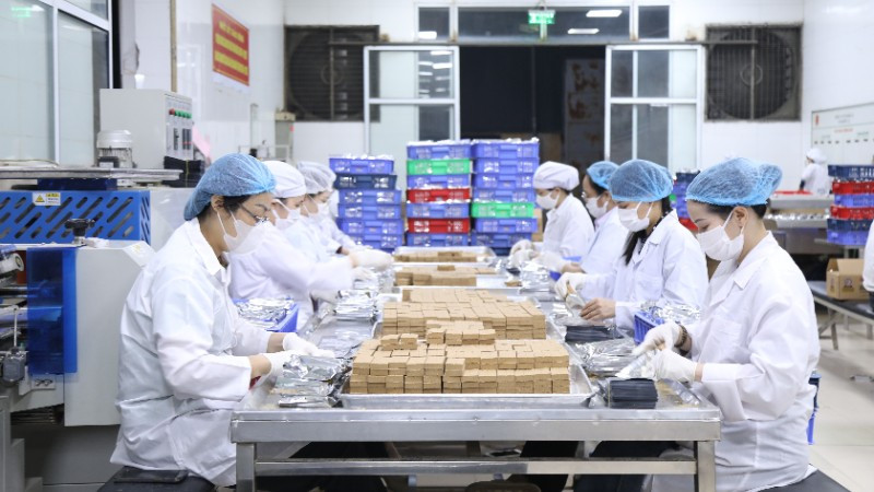Gần 12 giờ đêm, người lao động Công ty Cổ phần 22 vẫn miệt mài sản xuất để kịp thời hoàn thành 30 tấn lương khô hỗ trợ bà con vùng lũ.