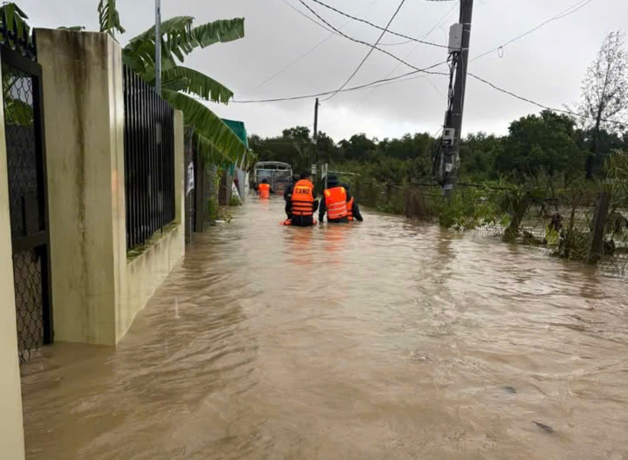 Lực lượng Công an tỉnh Khánh Hòa làm việc xuyên đêm ở vùng ngập lụt để giúp người dân.