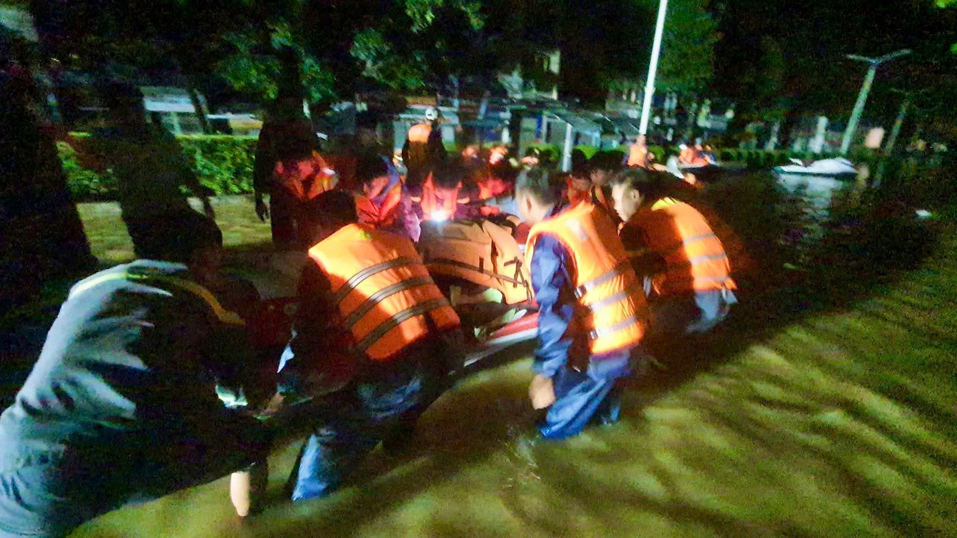Khuya 18/11, lực lượng cứu nạn, cứu hộ đưa một cháu bé bị hóc dị vật ở phường Tây Nha Trang ra khỏi vùng ngập và di chuyển đến bệnh viện an toàn. Ảnh: ANTV Khánh Hòa.