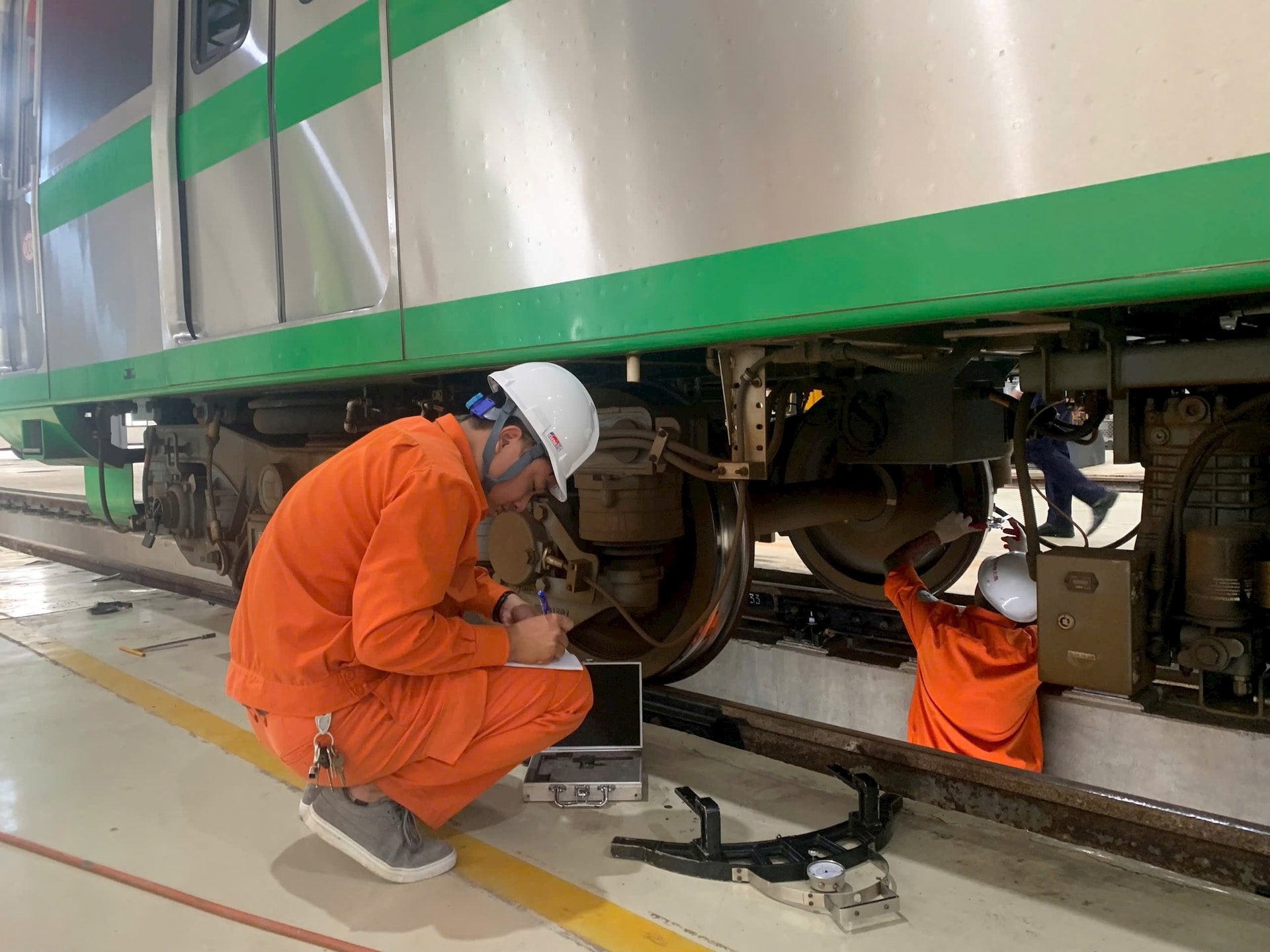 Các nhân viên tỉ mẩn đo và ghi chép độ mòn của từng bánh tàu. Ảnh: Tuấn Lương