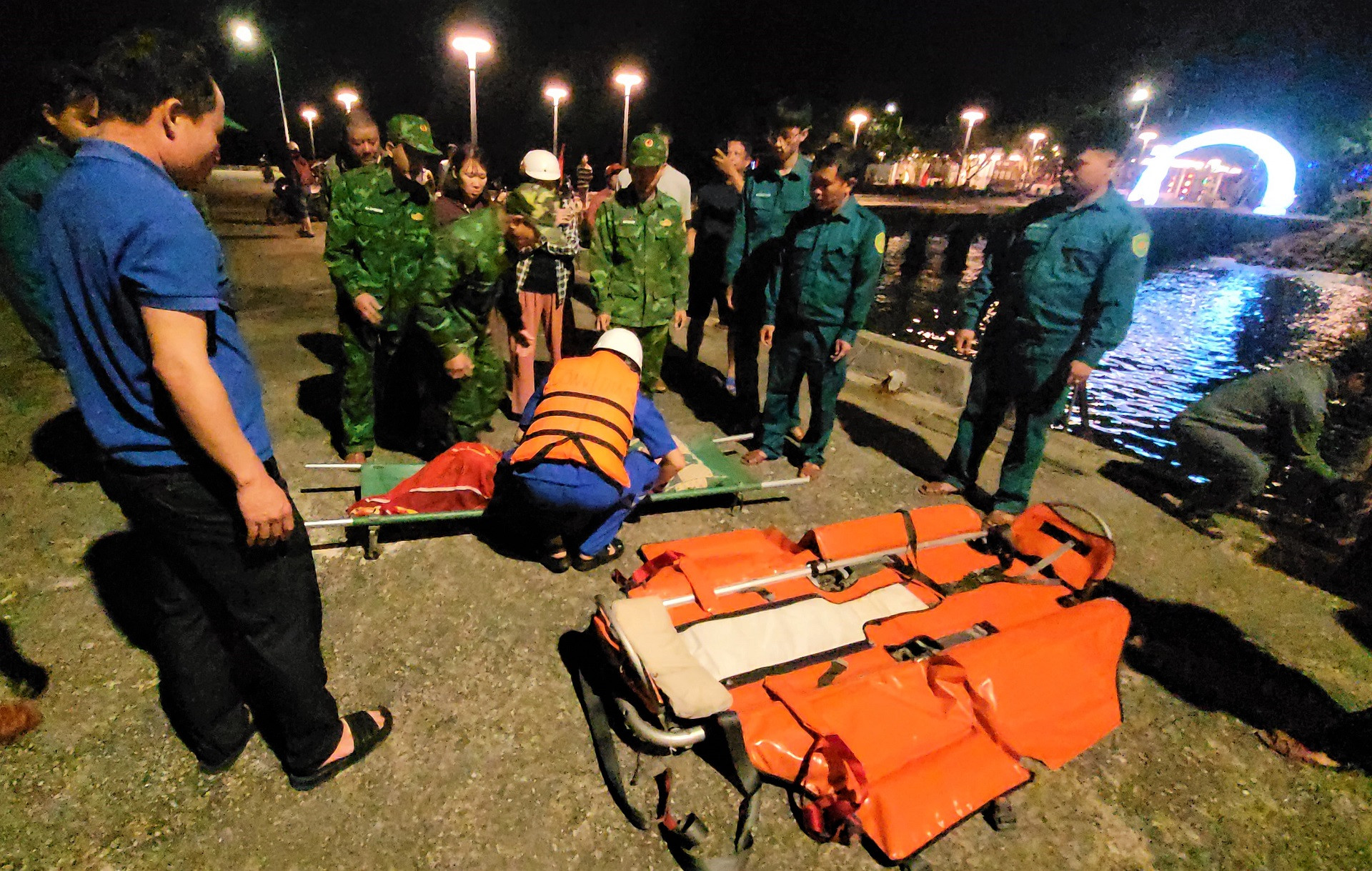 Lực lượng cứu nạn đưa nữ bệnh nhân từ tàu SAR 631 lên bờ để chuyển đến xe cấp cứu đưa vào bệnh viện điều trị. Ảnh: N.X