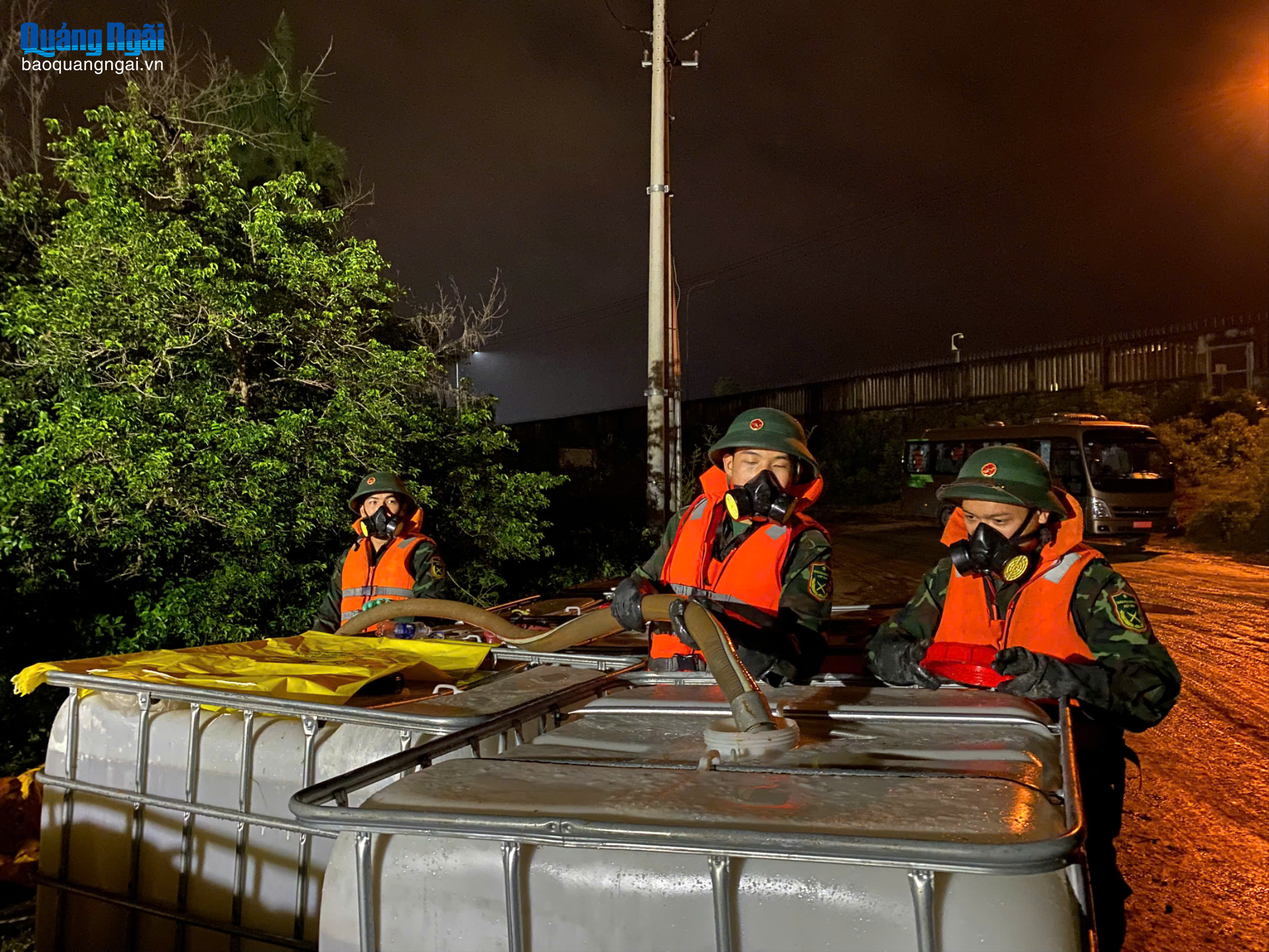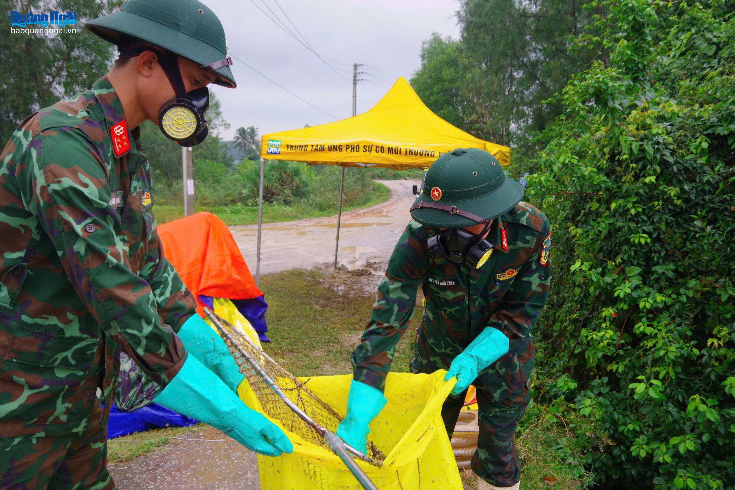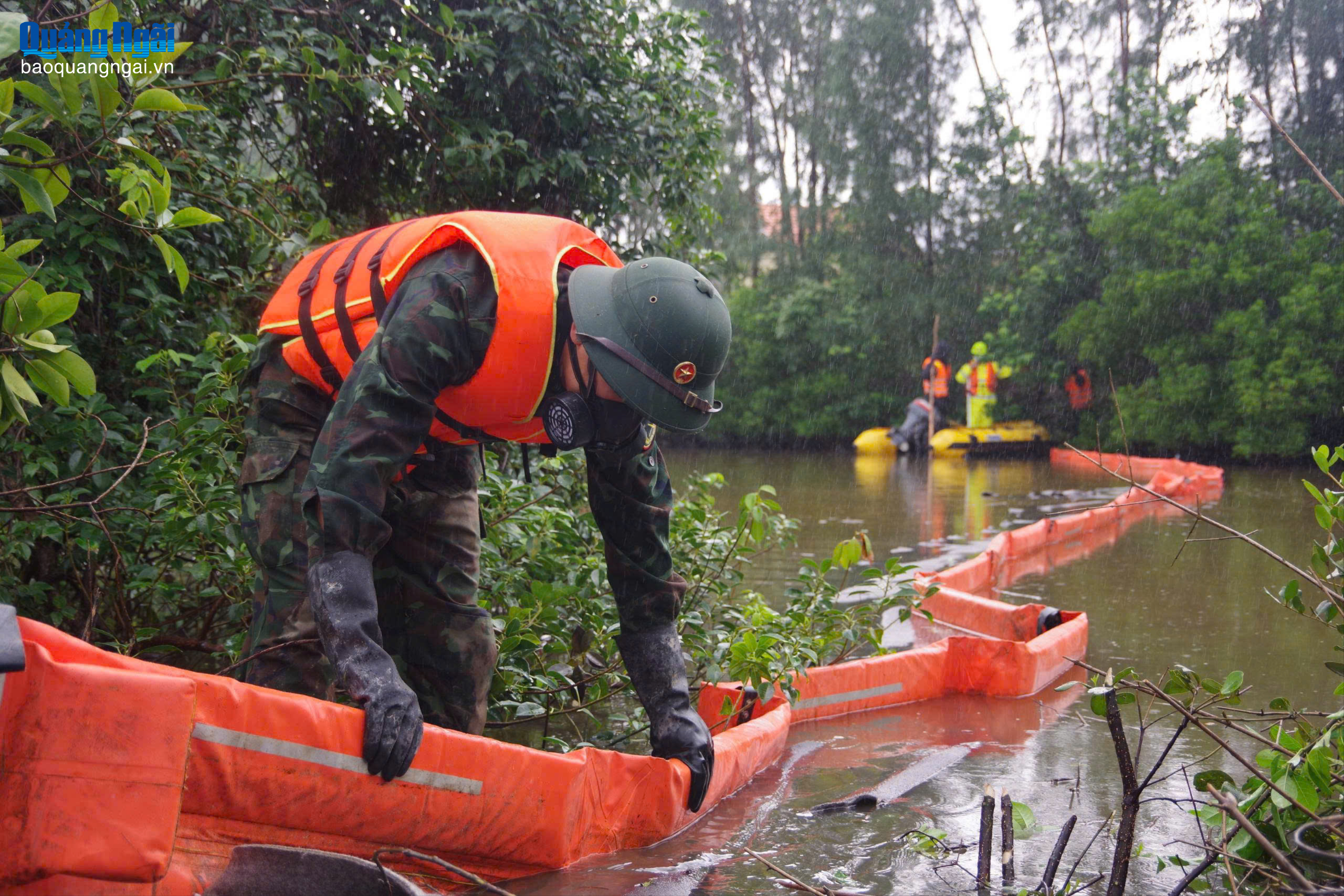 Khu vực có dầu nổi trên mặt nước tại sông Bàu Cá Cái, sông Đầm và các đoạn kênh, mương, ruộng sâu, bộ đội dùng phao gom dầu khoanh vùng khép kín. Sau đó dùng xuồng máy cao su để thu hẹp diện tích phao nhằm rút ngắn phạm vi dầu lan. Đồng thời phối hợp với PTSC Quảng Ngãi sử dụng máy chuyên dụng để thu gom dầu nổi trên mặt nước.