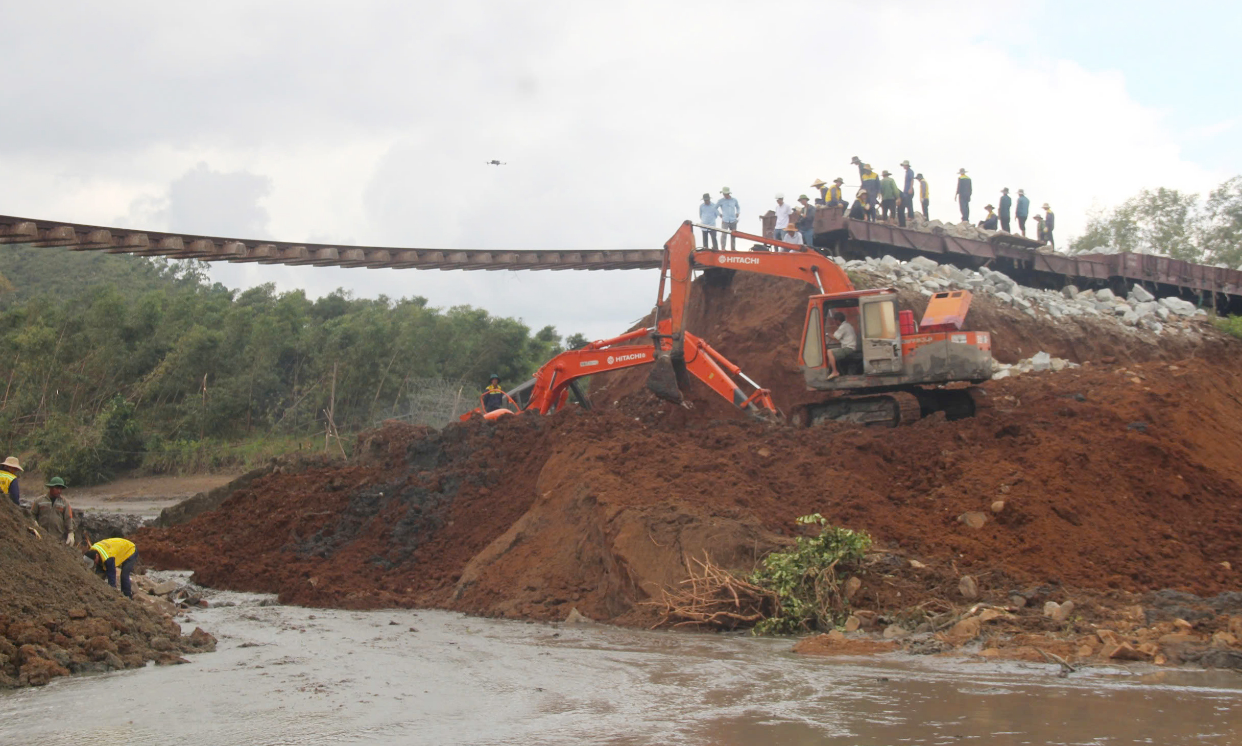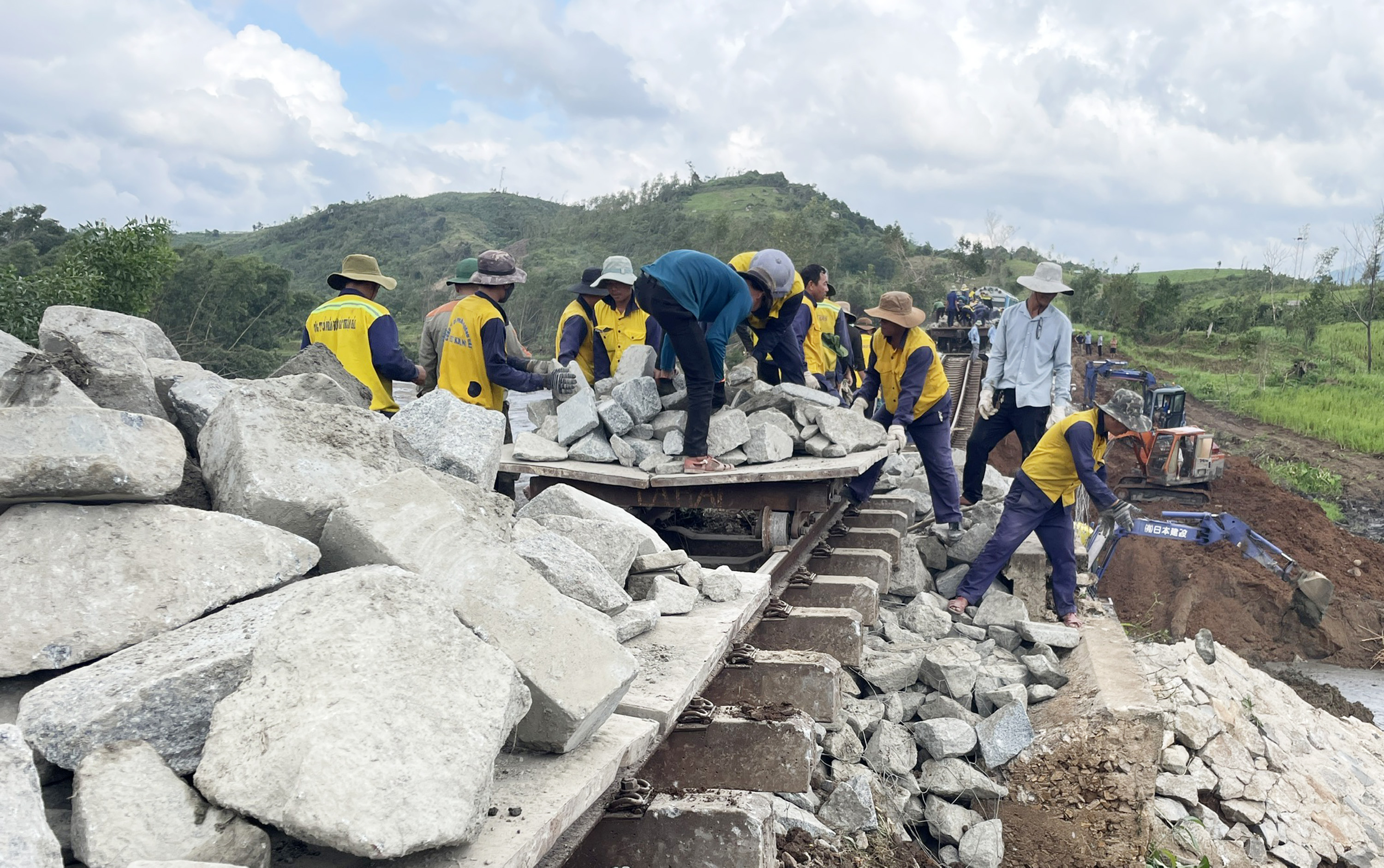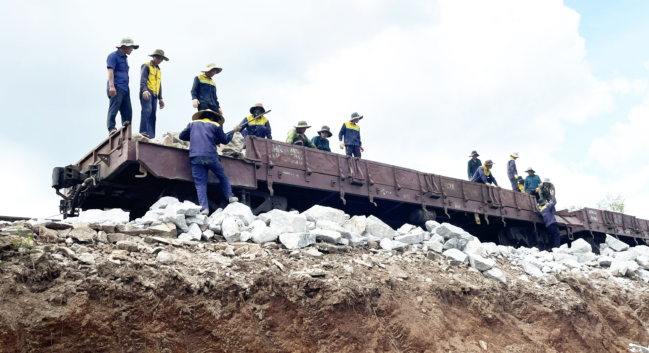 Đến sáng 9-11, các công nhân, kỹ sư vẫn đang nỗ lực huy động đoàn tàu và ô tô tải vận chuyển đá vào thôn Soi Nga để khắc phục các điểm hư hỏng, sạt lở trên tuyến đường sắt Bắc - Nam, đoạn Km1136 thuộc cung Vân Canh - Phước Lãnh.