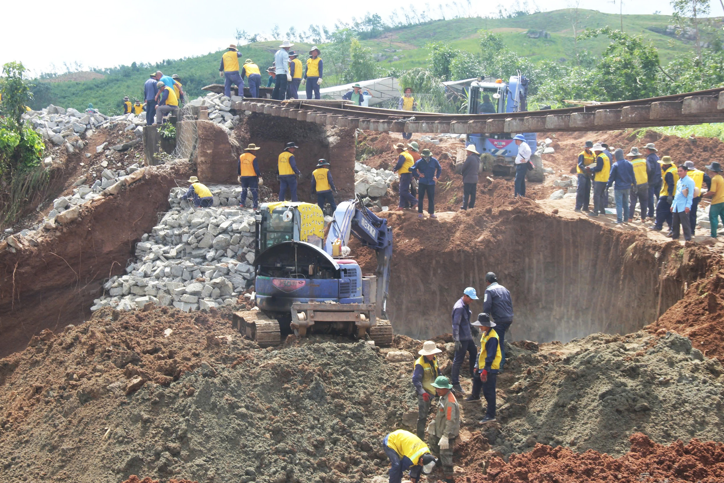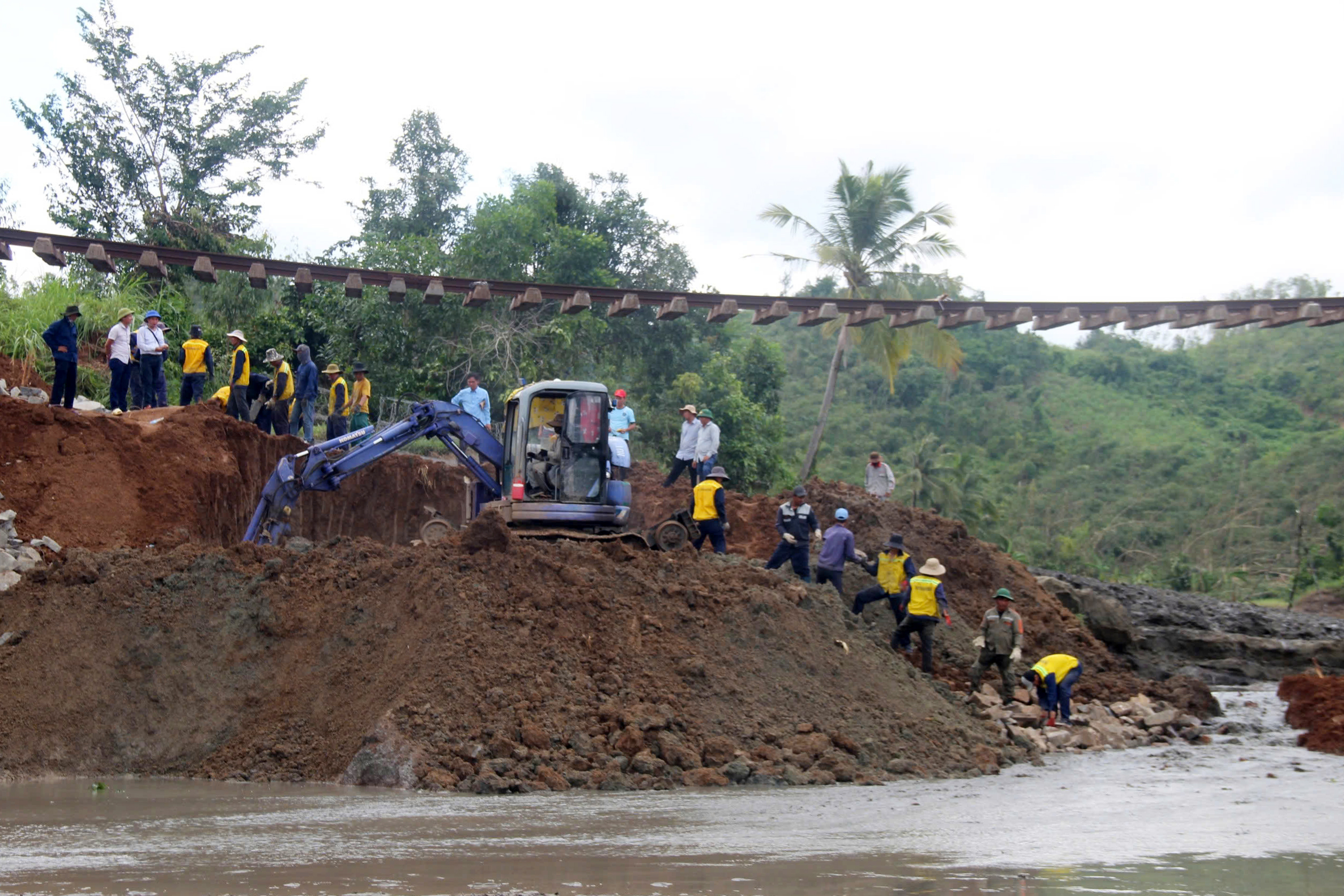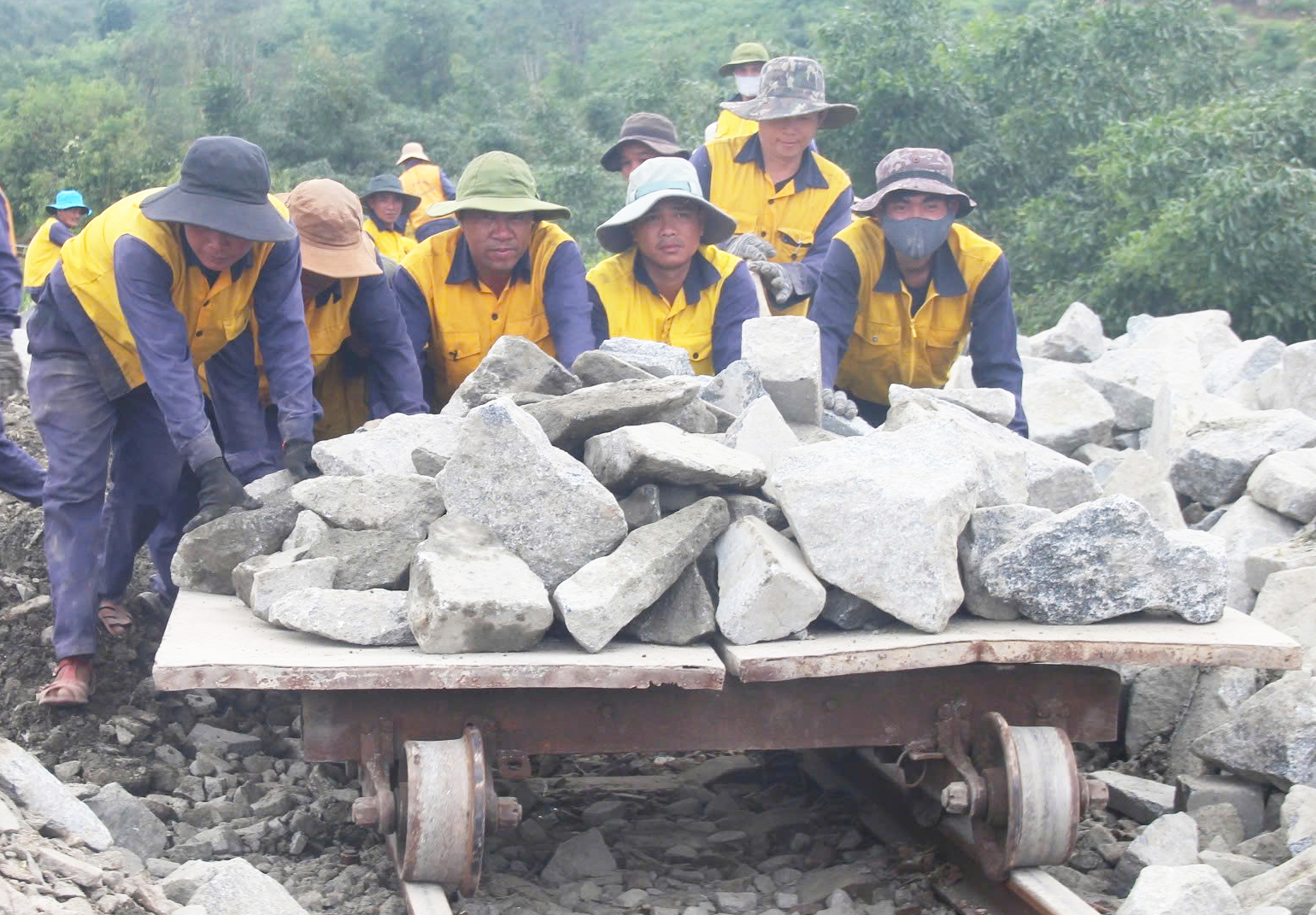 Đến sáng 9-11, các công nhân, kỹ sư vẫn đang nỗ lực huy động đoàn tàu và ô tô tải vận chuyển đá vào thôn Soi Nga để khắc phục các điểm hư hỏng, sạt lở trên tuyến đường sắt Bắc - Nam, đoạn Km1136 thuộc cung Vân Canh - Phước Lãnh.