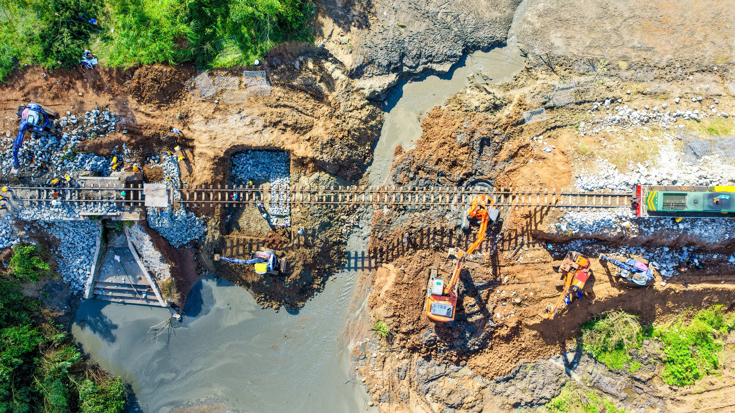 Cơ giới khơi thông mặt bằng để đổ đá hộc để tạo nền đường sắt