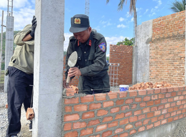 Đai úy Nguyễn Văn Phước, cán bộ Phòng CSCĐ Công an tỉnh Đắk Lắk làm thợ xây nhà người dân ở xã Xuân Cảnh.