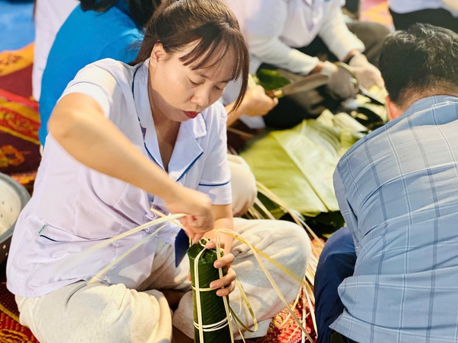 Trong không khí rộn ràng, các y bác sĩ, điều dưỡng, nhân viên y tế cùng nhau chuẩn bị lá dong, gạo nếp, đỗ xanh, thịt lợn để gói bánh theo phương pháp truyền thống. Từng chiếc bánh được gói vuông vắn, chặt tay. Các đội còn đầu tư phần trưng bày, tái hiện không gian Tết cổ truyền, tạo nên không khí gần gũi, ấm áp ngay trong khuôn viên trung tâm.