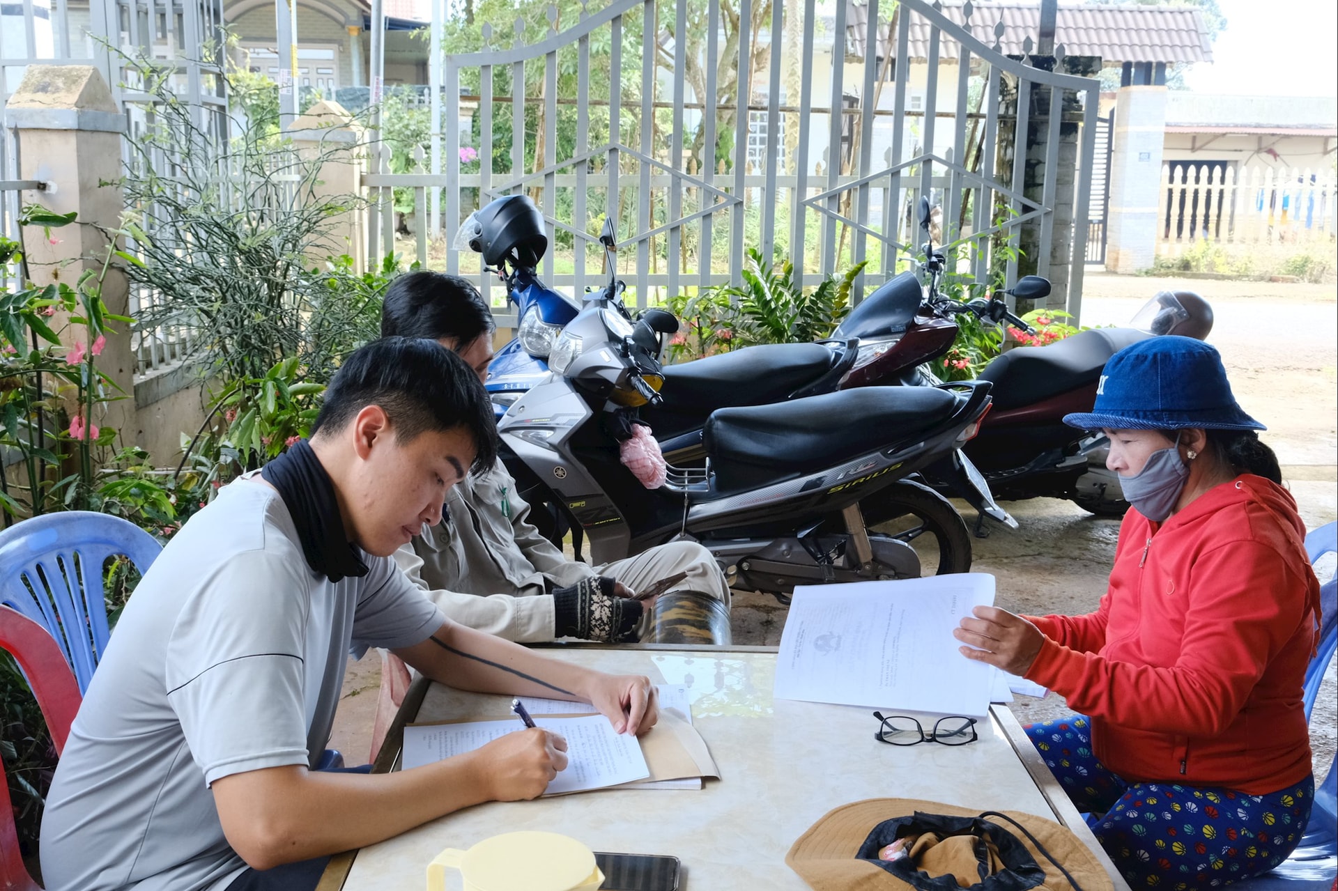 Bà Trần Thị Sen (thôn Tân Nghĩa, xã Bảo Thuận) vui vẻ phối hợp cùng cán bộ Trung tâm Phát triển Quỹ đất tỉnh kiểm kê tài sản bị ảnh hưởng để phục vụ dự án cao tốc.