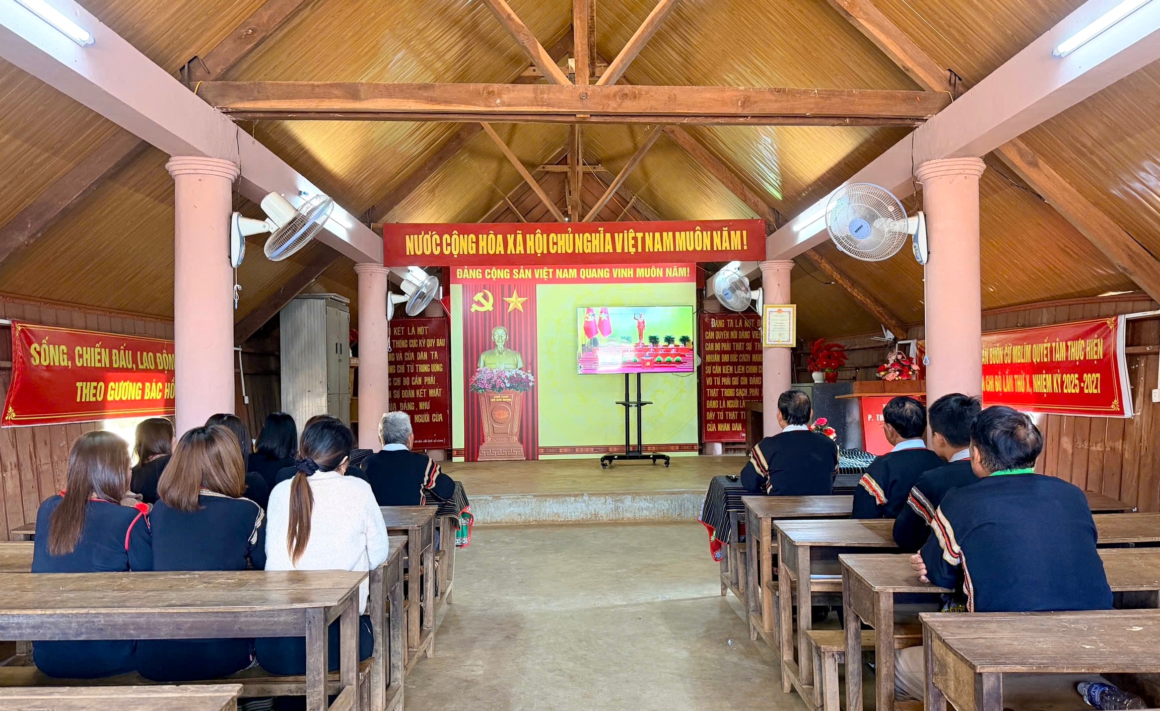 Người dân phường Ea Kao theo dõi khai mạc Đại hội qua màn hình tại nhà cộng đồng buôn Cư Mblim