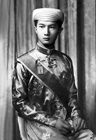 Hoàng thái tử Bảo Long, con vua Bảo Đại, mặc trang phục thường triều thêu hình viên long.