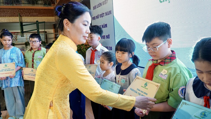Đại diện Hội Liên hiệp Phụ nữ phường Chợ Lớn trao học bổng cho các em học sinh hiếu học