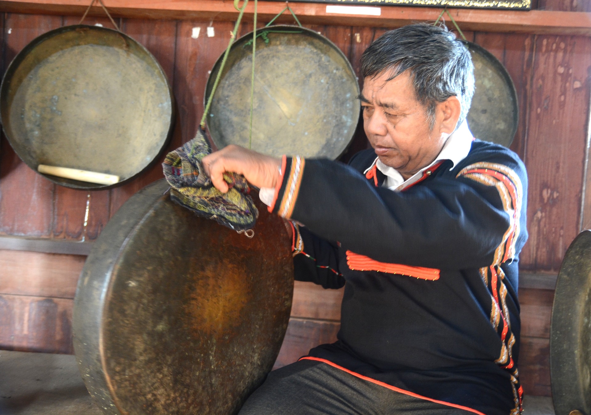 Các thành viên đội cồng chiêng buôn Nui do ông Y Sim dẫn dắt thường xuyên luyện tập, giữ gìn cẩn thận các bộ chiêng để phục vụ tốt các hoạt động văn hóa tại địa phương