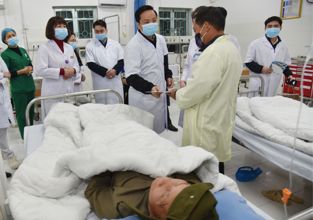 Chủ tịch UBND tỉnh Lê Hải Hòa động viên các bệnh nhân và người nhà đang điều trị tại Khoa Cấp cứu, Bệnh viện Đa khoa tỉnh.