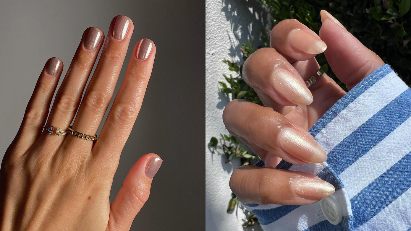 Nếu bạn yêu thích xu hướng nail glazed-donut nhưng không muốn từ bỏ vẻ đẹp tự nhiên, thì màu chrome nude hơi ngả sang hồng nhạt là lựa chọn lý tưởng. Bộ móng này được tạo ra bằng lớp nền là sơn màu nude hoặc hồng ngọc trai, sau đó tán bột chrome để đạt được độ bóng mà bạn yêu thích.