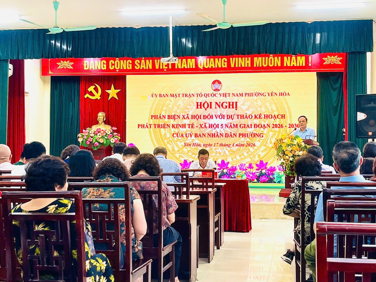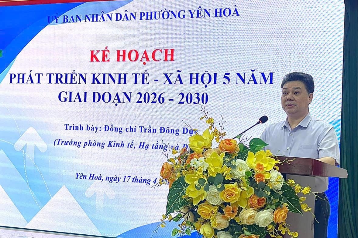 Trưởng phòng Kinh tế, Hạ tầng và Đô thị phường Yên Hòa Trần Đông Dực trình bày Dự thảo kế hoạch phát triển kinh tế - xã hội giai đoạn 2026-2030 của UBND phường. Ảnh: PV