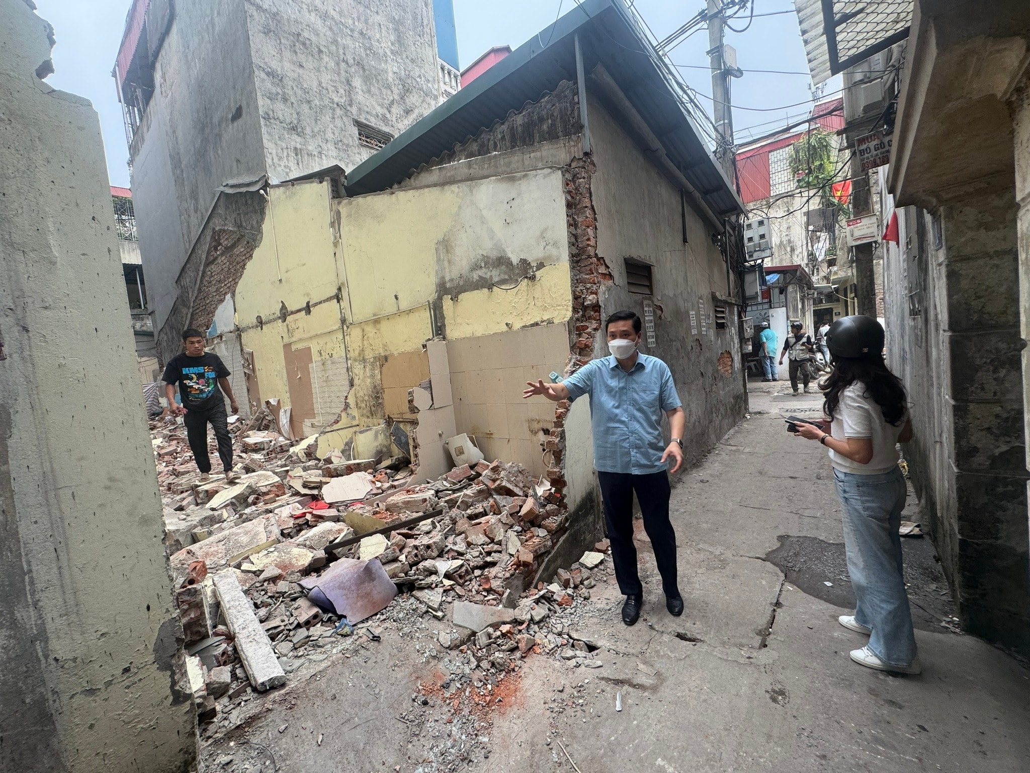 Bí thư Đảng ủy, Chủ tịch HĐND, Trưởng ban Chỉ đạo công tác GPMB phường Yên Hòa Nguyễn Quốc Khánh kiểm tra tiến độ phá dỡ tại khu tập thể 354, đẩy nhanh bàn giao mặt bằng cho dự án Vành đai 2,5. Ảnh:PV