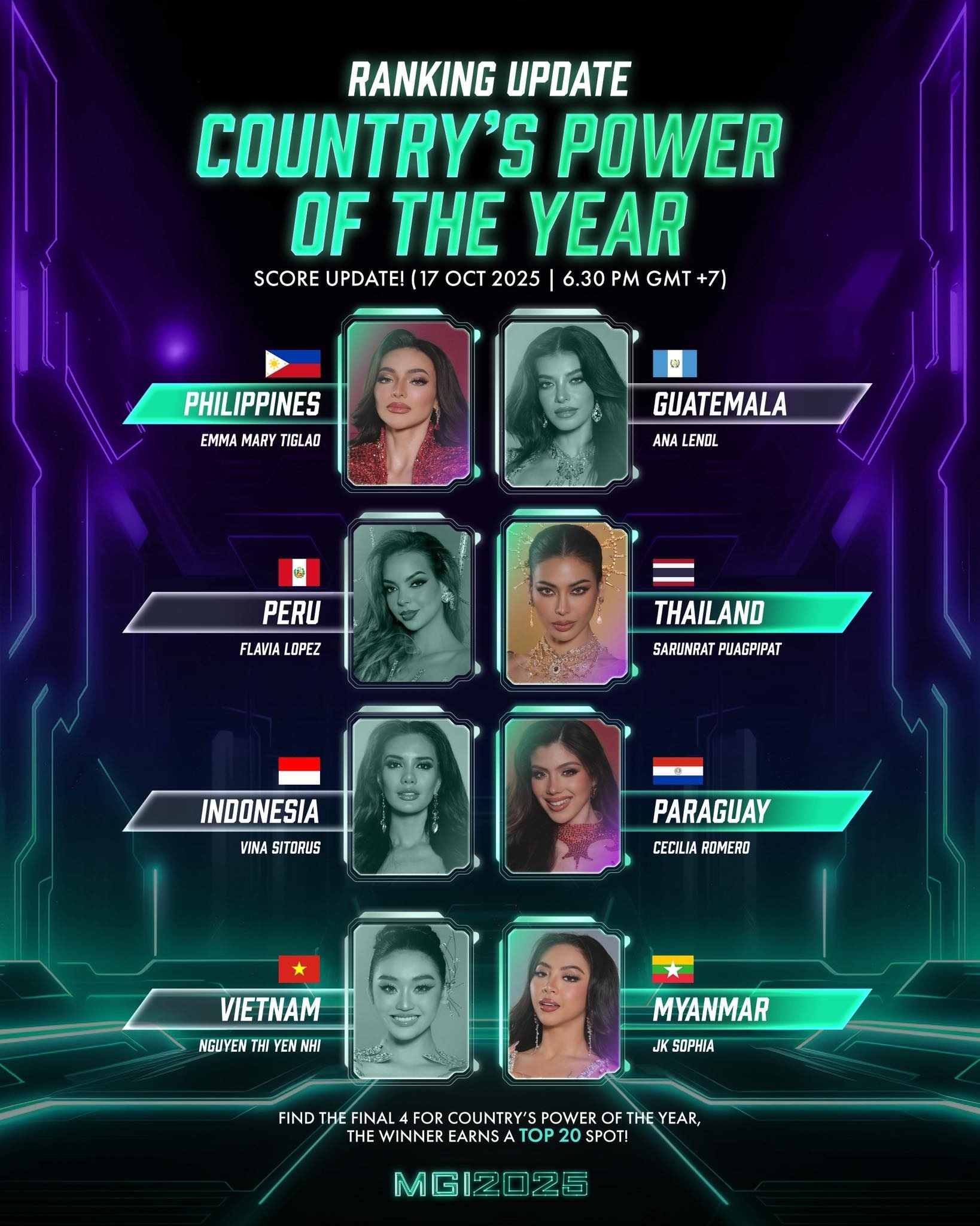 Tối 17/10, trang chủ Miss Grand International 2025 công bố kết quả giải Country's Power of the Year (Sức mạnh quốc gia). Đại diện Việt Nam là Hoa hậu Yến Nhi không có tên trong danh sách thắng cuộc vòng bảng.