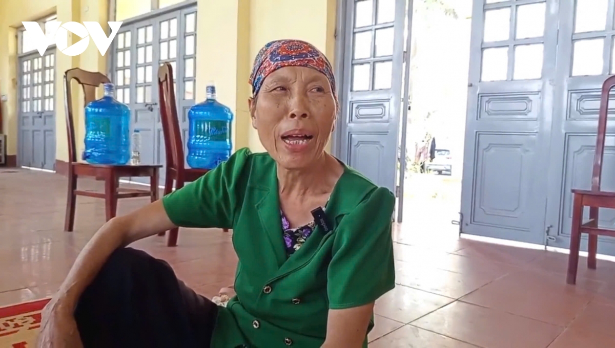 Bà Hoàng Thị Lan, 67 tuổi, hiện đang trú tạm tại trụ sở Ủy ban xã cũ cùng gần 20 người già. Đã 4 ngày nay, bà trải chiếu ngủ tạm trên nền hội trường, bên cạnh là túi áo quần và vài món đồ khô được cứu trợ.
