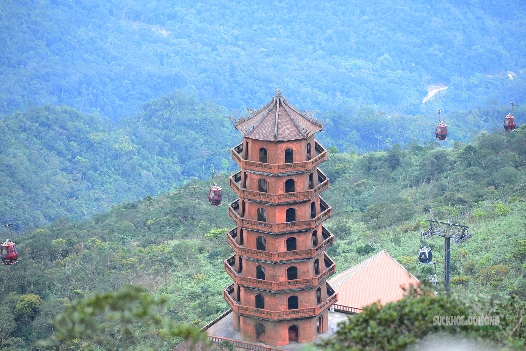 Tháp chùa vươn cao giữa núi rừng, bên cạnh tuyến cáp treo Yên Tử.