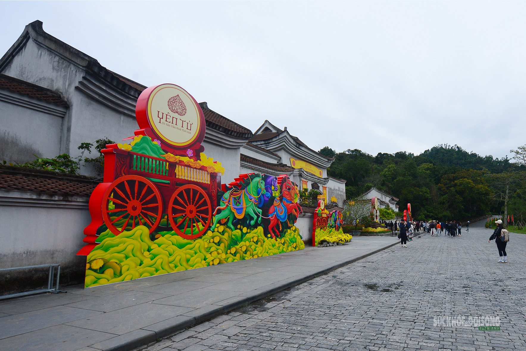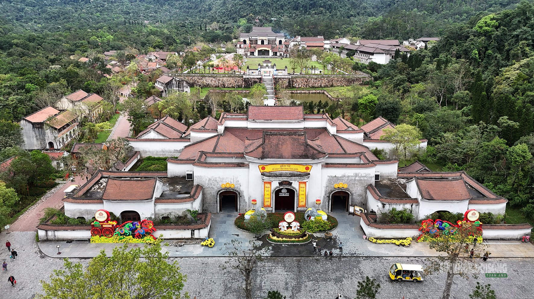 Không gian trang trí rực rỡ tại khu vực chân núi Yên Tử đón du khách hành hương.